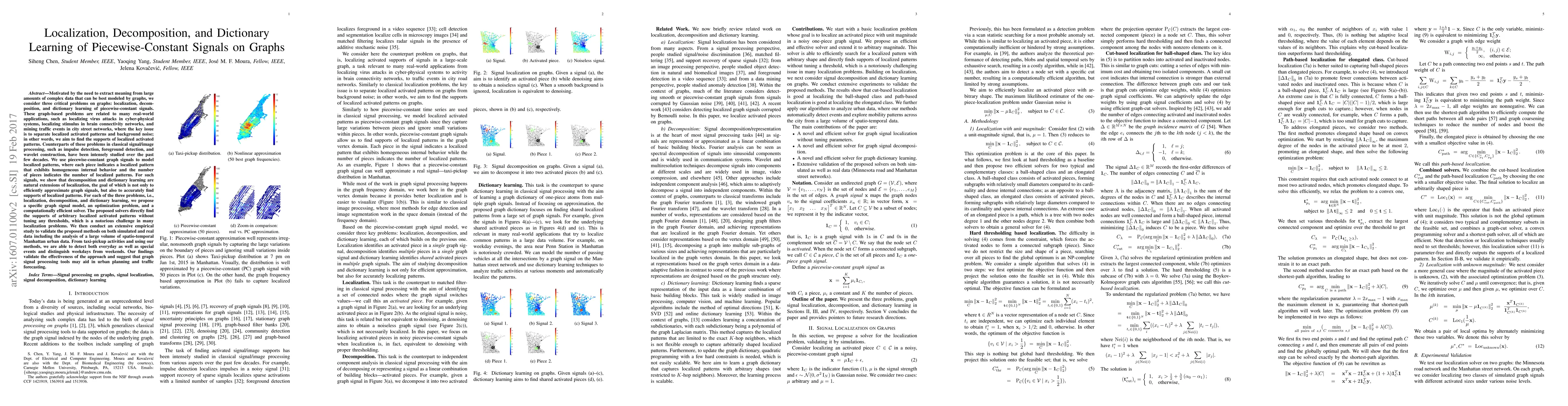 This paper addresses localization, decomposition, and dictionary learning of piecewise-constant signals on graphs, proposing efficient solvers for each problem to find localized activated patterns without threshold tuning. The methods are validated on simulated and real-world urban data, demonstrating their potential in applications like urban planning and traffic forecasting.