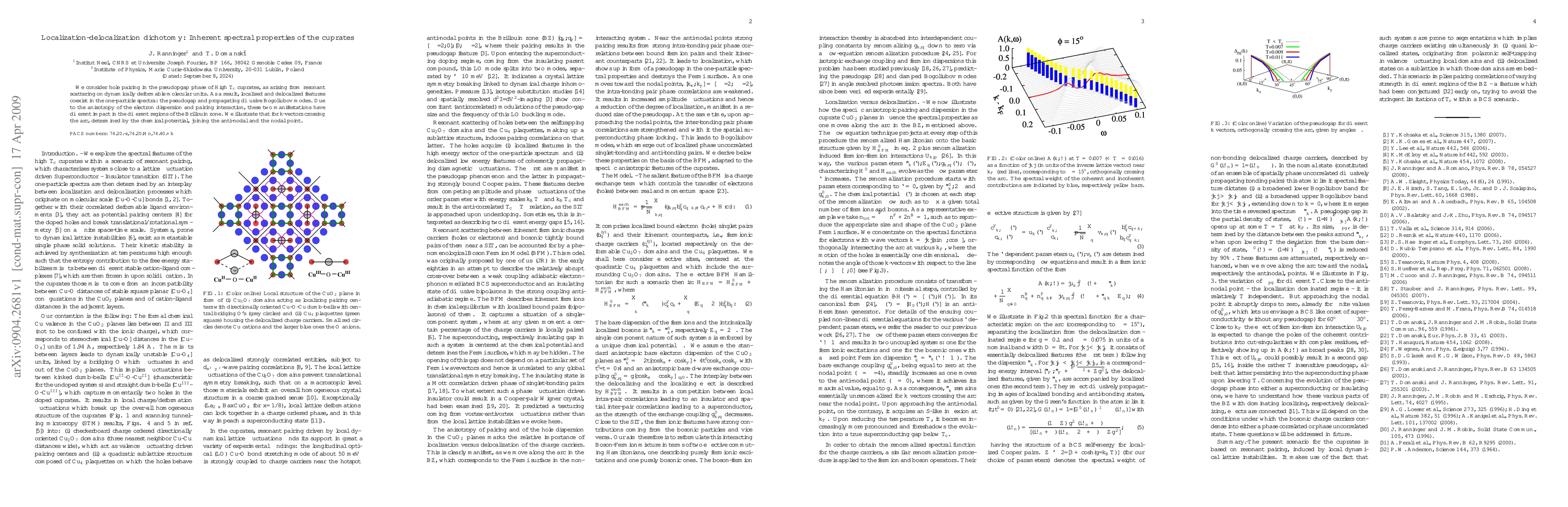 We consider hole pairing in the pseudopgap phase of High T_c cuprates, as arising from resonant scattering on dynamically deformable molecular units. As a result, localized and delocalized features coexist in the one-particle spectra: the pseudogap and propagating diffusive Bogoliubov modes. Due to the anisotropy of the electron dispersion and pairing interaction, these two manifestations have different impact in the different regions of the Brillouin zone. We illustrate that for k-vectors crossing the arc, determined by the chemical potential, joining the anti-nodal and the nodal point.
