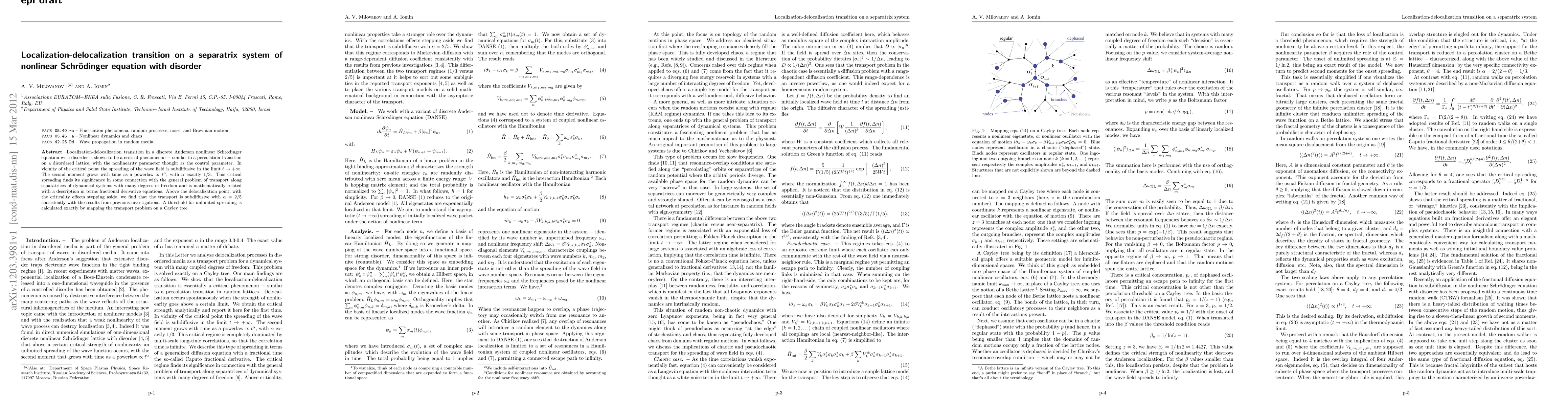 Localization-delocalization transition in a discrete Anderson nonlinear Schr\"odinger equation with disorder is shown to be a critical phenomenon $-$ similar to a percolation transition on a disordered lattice, with the nonlinearity parameter thought as the control parameter. In vicinity of the critical point the spreading of the wave field is subdiffusive in the limit $t\rightarrow+\infty$. The second moment grows with time as a powerlaw $\propto t^\alpha$, with $\alpha$ exactly 1/3. This critical spreading finds its significance in some connection with the general problem of transport along separatrices of dynamical systems with many degrees of freedom and is mathematically related with a description in terms fractional derivative equations. Above the delocalization point, with the criticality effects stepping aside, we find that the transport is subdiffusive with $\alpha = 2/5$ consistently with the results from previous investigations. A threshold for unlimited spreading is calculated exactly by mapping the transport problem on a Cayley tree.