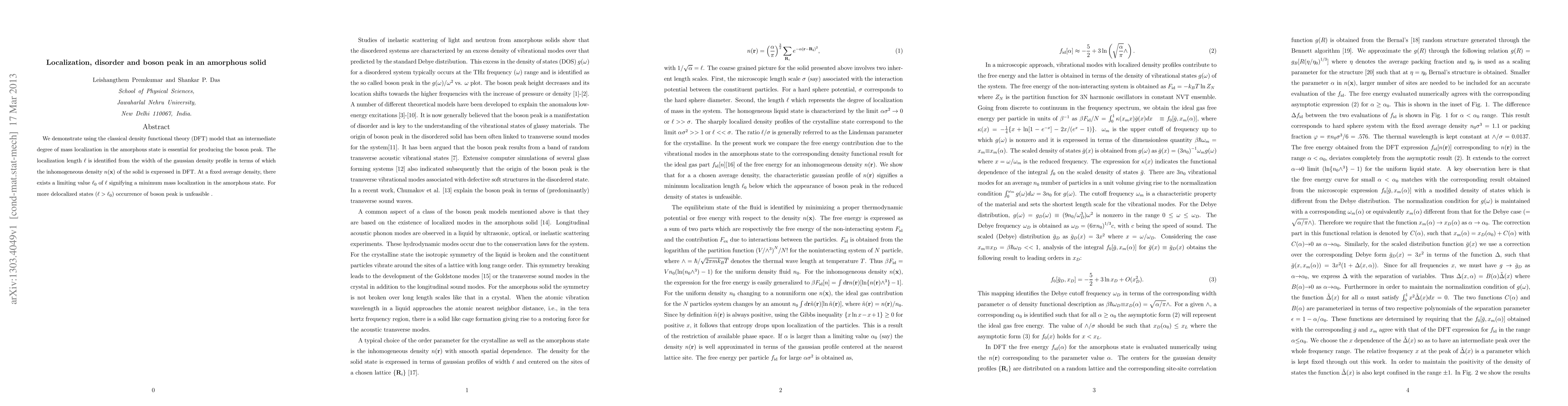 We demonstrate using the classical density functional theory (DFT) model that an intermediate degree of mass localization in the amorphous state is essential for producing the boson peak. The localization length $\ell$ is identified from the width of the gaussian density profile in terms of which the inhomogeneous density n(x) of the solid is expressed in DFT. At a fixed average density, there exists a limiting value $\ell_0$ of $\ell$ signifying a minimum mass localization in the amorphous state. For more delocalized states ($\ell>\ell_0$) occurrence of boson peak is unfeasible.