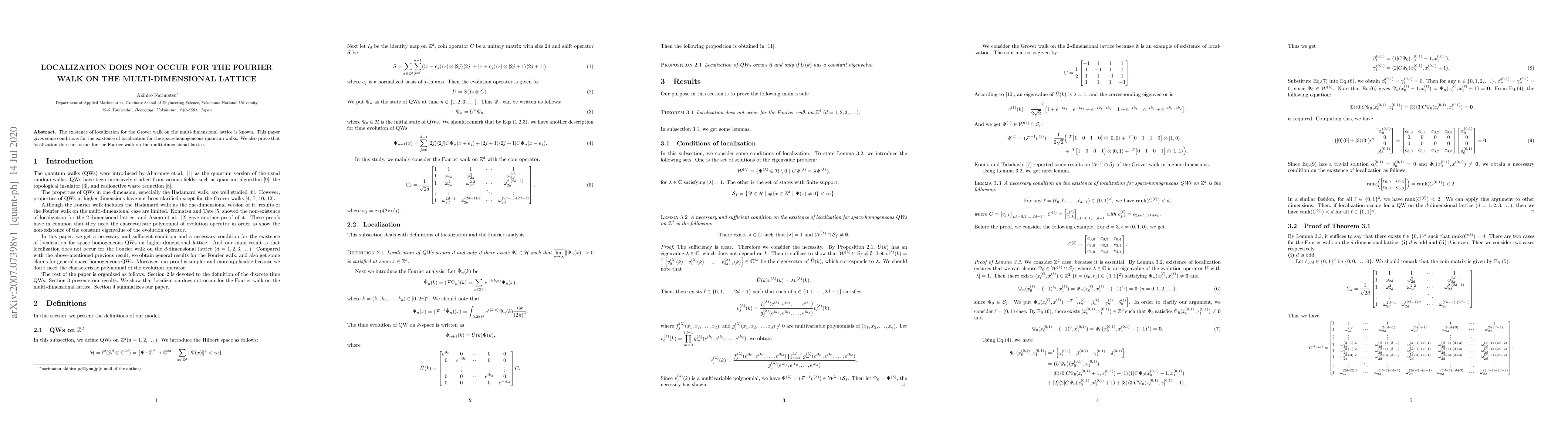 This paper investigates the conditions for localization in space-homogeneous quantum walks, specifically proving that localization does not occur for the Fourier walk on multi-dimensional lattices, despite its presence in the Grover walk.