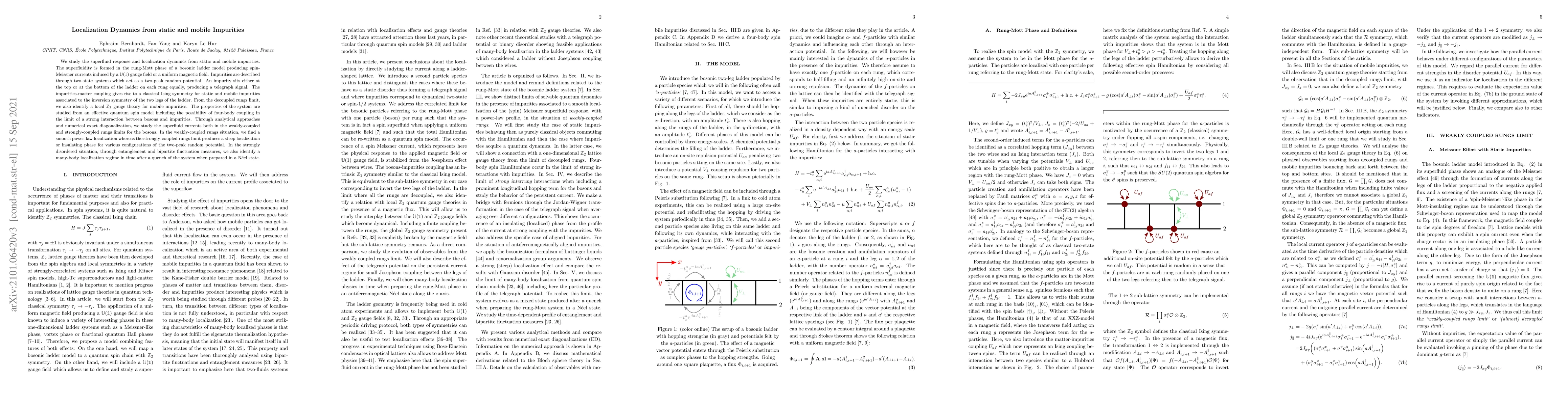 We study the superfluid response and localization dynamics from static and mobile impurities. The superfluidity is formed in the rung-Mott phase of a bosonic ladder model producing spin-Meissner currents induced by a $\mathbb{U}(1)$ gauge field or a uniform magnetic field. Impurities are described through two-state systems which act as a two-peak random potential. An impurity sits either at the top or at the bottom of the ladder on each rung equally, producing a telegraph signal. The impurities-matter coupling gives rise to a classical Ising symmetry for static and mobile impurities associated to the inversion symmetry of the two legs of the ladder. From the decoupled rungs limit, we also identify a local $\mathbb{Z}_2$ gauge theory for mobile impurities. The properties of the system are studied from an effective quantum spin model including the possibility of four-body coupling in the limit of a strong interaction between bosons and impurities. Through analytical approaches and numerical exact diagonalization, we study the superfluid currents both in the weakly-coupled and strongly-coupled rungs limits for the bosons. In the weakly-coupled rungs situation, we find a smooth power-law localization whereas the strongly-coupled rungs limit produces a steep localization or insulating phase for various configurations of the two-peak random potential. In the strongly disordered situation, through entanglement and bipartite fluctuation measures, we also identify a many-body localization regime in time after a quench of the system when prepared in a N\' eel state.