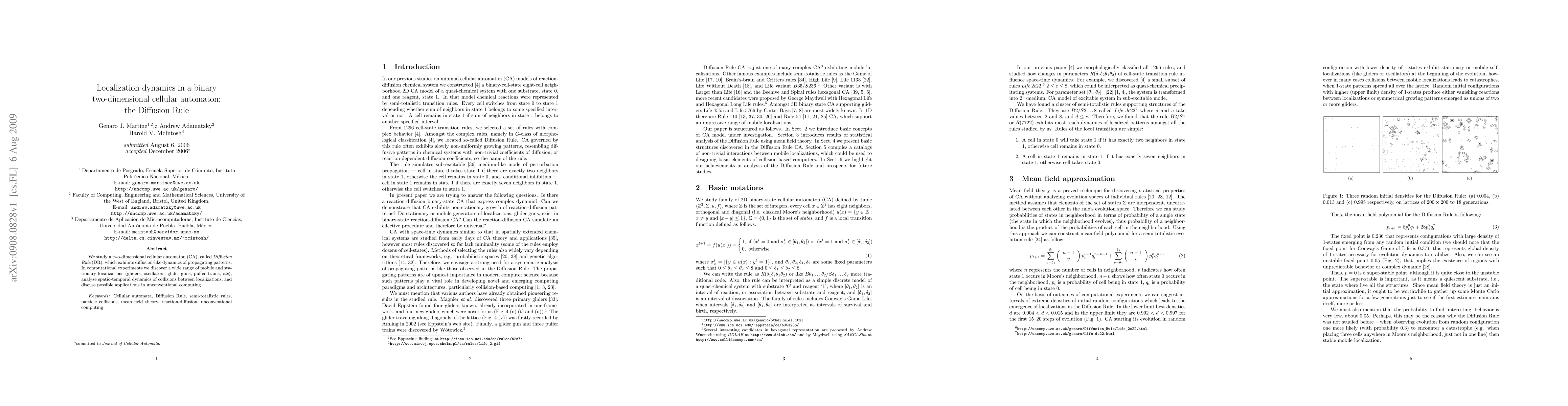 This paper investigates the Diffusion Rule, a two-dimensional cellular automaton, focusing on its pattern propagation dynamics and various localizations like gliders and oscillators. The study also explores the spatio-temporal behavior of localization collisions and considers its potential for unconventional computing applications.
