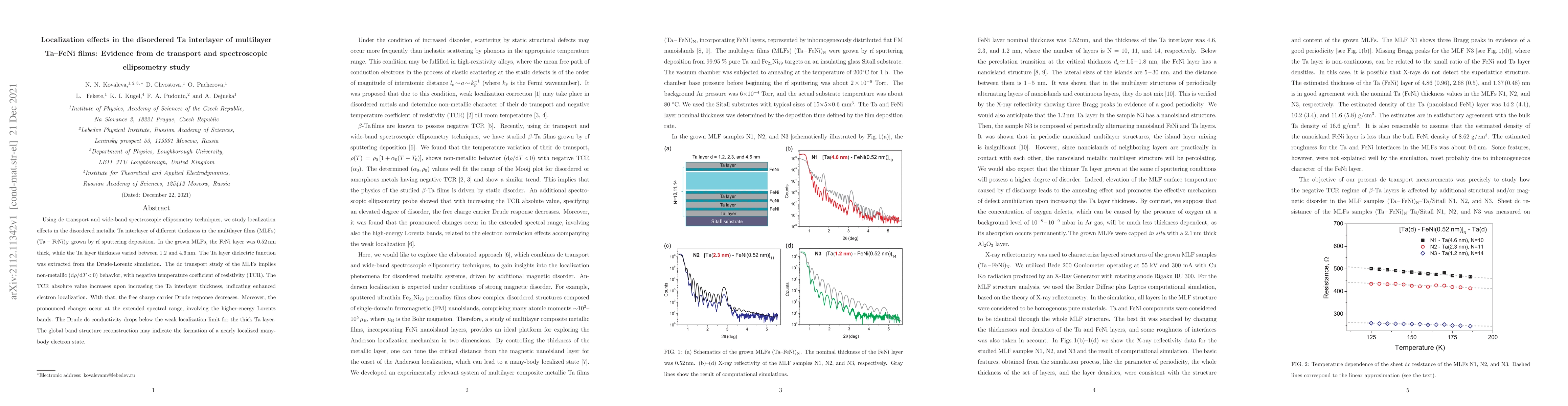 Using dc transport and wide-band spectroscopic ellipsometry techniques, we study localization effects in the disordered metallic Ta interlayer of different thickness in the multilayer films (MLFs) (Ta - FeNi)_N grown by rf sputtering deposition. In the grown MLFs, the FeNi layer was 0.52 nm thick, while the Ta layer thickness varied between 1.2 and 4.6 nm. The Ta layer dielectric function was extracted from the Drude-Lorentz simulation. The dc transport study of the MLFs implies non-metallic (dr/dT<0) behavior, with negative temperature coefficient of resistivity (TCR). The TCR absolute value increases upon increasing the Ta interlayer thickness, indicating enhanced electron localization. With that, the free charge carrier Drude response decreases. Moreover, the pronounced changes occur at the extended spectral range, involving the higher-energy Lorentz bands. The Drude dc conductivity drops below the weak localization limit for the thick Ta layer. The global band structure reconstruction may indicate the formation of a nearly localized many-body electron state.