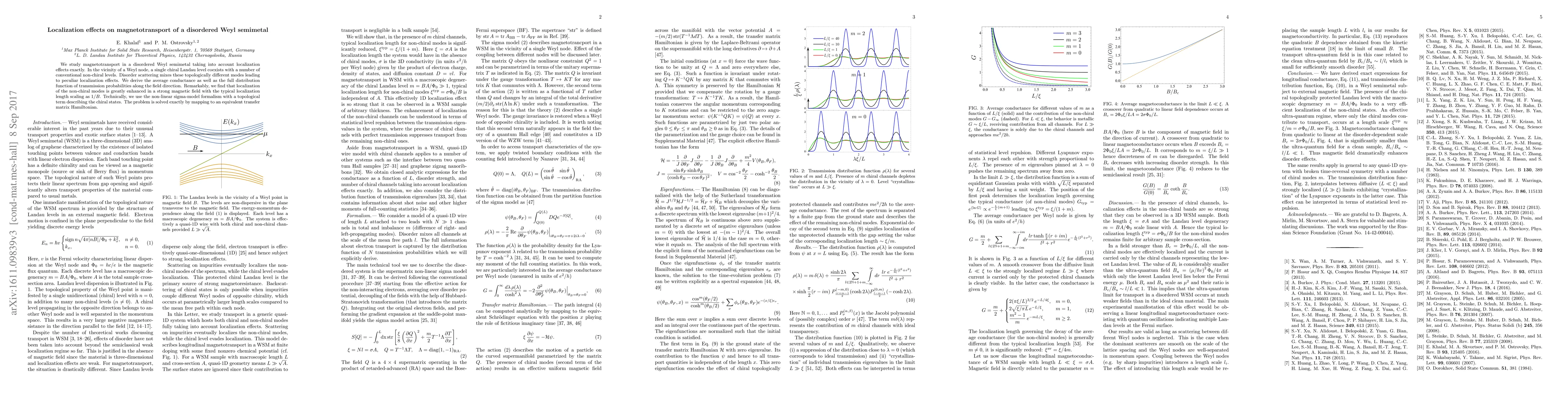 This paper investigates magnetotransport in a disordered Weyl semimetal, revealing enhanced localization of non-chiral modes in strong magnetic fields due to disorder-induced mixing of topologically different modes. The study employs a non-linear sigma-model and an equivalent transfer matrix Hamiltonian to derive the average conductance and distribution of transmission probabilities.