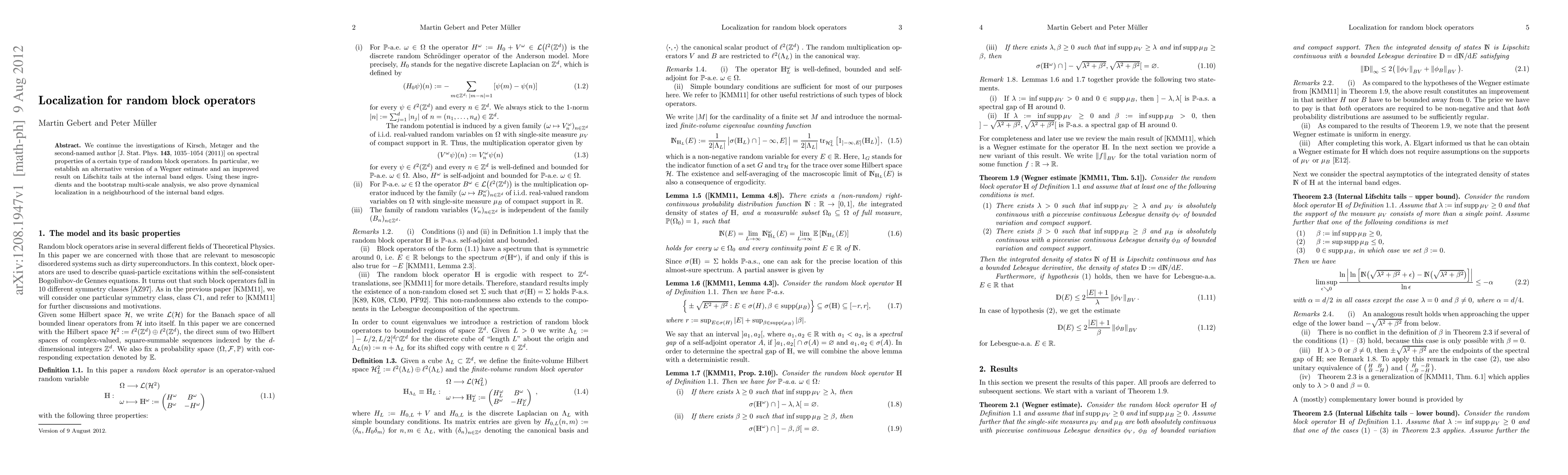 This paper explores localization for random block operators, establishing a new estimate of Wegner's method and improving results on Lifschitz tails near internal band edges, leading to dynamical localization in a neighborhood of these edges.