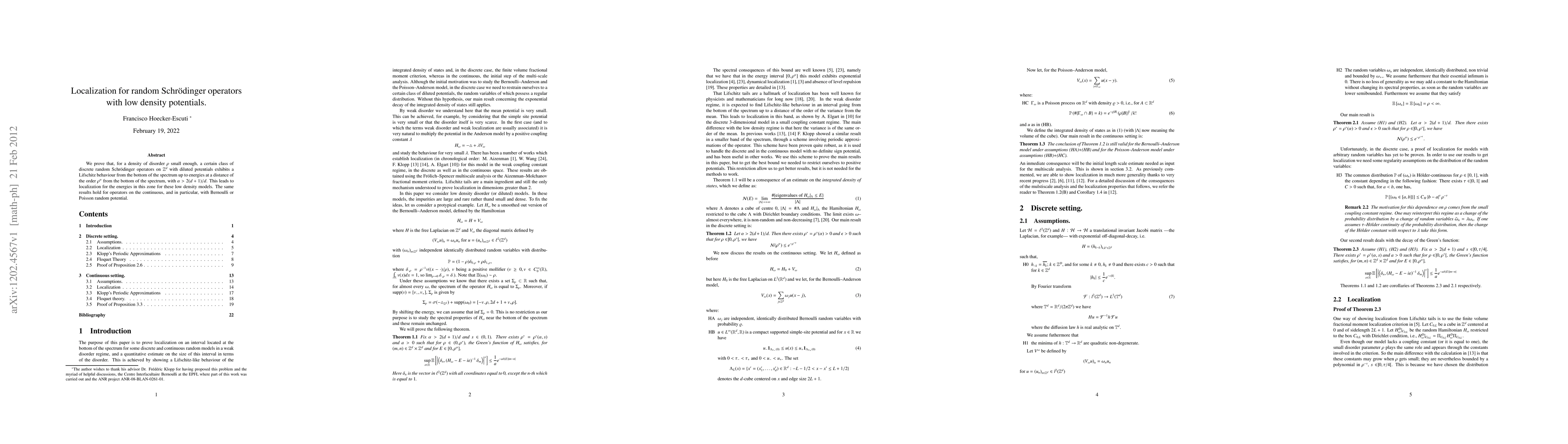 Title: Localization for random Schrödinger operators with low density potentials Summary: For sufficiently low disorder density, certain random Schrödinger operators on $\Z^d$ exhibit localization effects in a spectral region close to the bottom, characterized by Lifshitz tails, leading to energy localization. The results extend to continuous operators with Bernoulli or Poisson potentials.