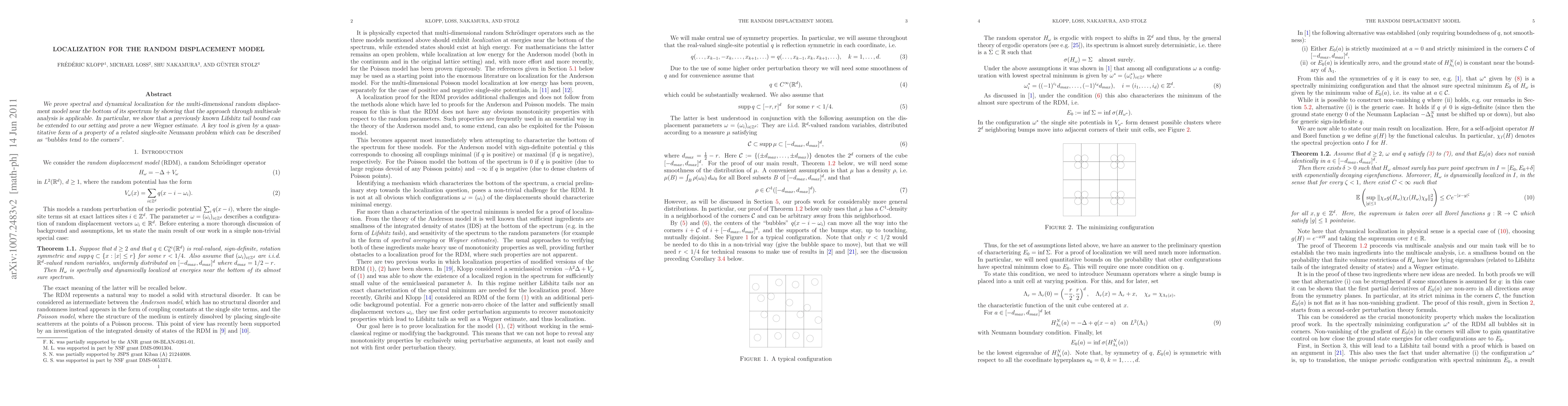 Researchers prove spectral and dynamical localization for a multi-dimensional random displacement model near its bottom spectrum using multiscale analysis and a new Wegner estimate. They also extend a known Lifshitz tail bound to this setting.