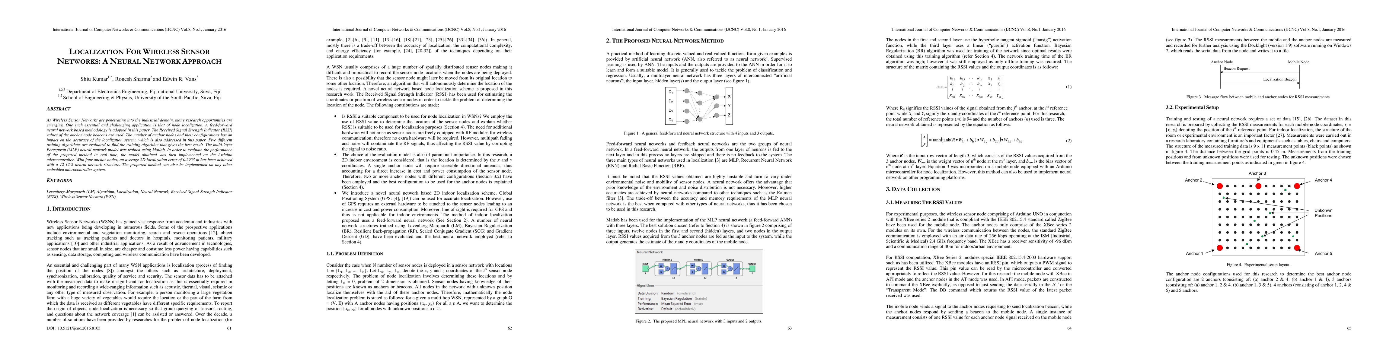 This paper proposes a neural network-based approach for localizing nodes in Wireless Sensor Networks using Received Signal Strength Indicator values from anchor nodes. The study evaluates five training algorithms and implements the best-performing multi-layer Perceptron model on an Arduino microcontroller, achieving an average 2D localization error of 0.2953 m with four anchor nodes.