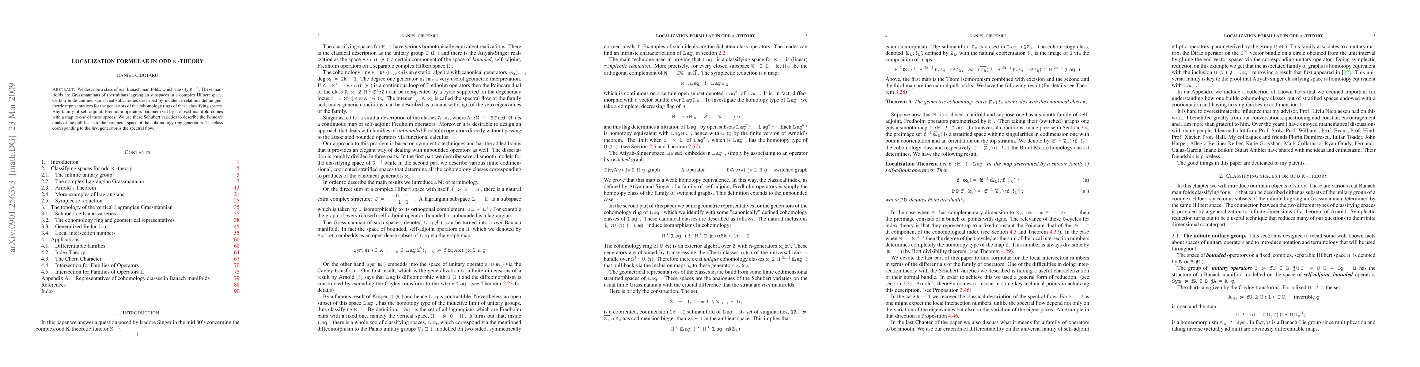 We describe a class of real Banach manifolds, which classify $K^{-1}$. These manifolds are Grassmannians of (hermitian) lagrangian subspaces in a complex Hilbert space. Certain finite codimensional real subvarieties described by incidence relations define geometric representatives for the generators of the cohomology rings of these classifying spaces. Any family of self-adjoint, Fredholm operators parametrized by a closed manifold comes with a map to one of these spaces. We use these Schubert varieties to describe the Poincare duals of the pull-backs to the parameter space of the cohomology ring generators. The class corresponding to the first generator is the spectral flow.