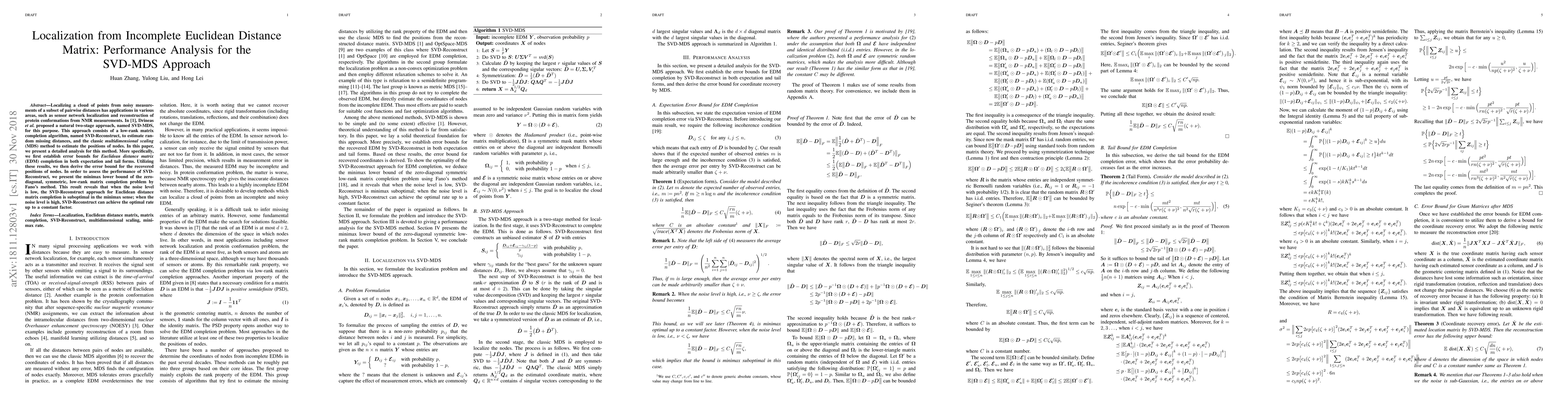 Localizing a cloud of points from noisy measurements of a subset of pairwise distances has applications in various areas, such as sensor network localization and reconstruction of protein conformations from NMR measurements. In [1], Drineas et al. proposed a natural two-stage approach, named SVD-MDS, for this purpose. This approach consists of a low-rank matrix completion algorithm, named SVD-Reconstruct, to estimate random missing distances, and the classic multidimensional scaling (MDS) method to estimate the positions of nodes. In this paper, we present a detailed analysis for this method. More specifically, we first establish error bounds for Euclidean distance matrix (EDM) completion in both expectation and tail forms. Utilizing these results, we then derive the error bound for the recovered positions of nodes. In order to assess the performance of SVD-Reconstruct, we present the minimax lower bound of the zero-diagonal, symmetric, low-rank matrix completion problem by Fano's method. This result reveals that when the noise level is low, the SVD-Reconstruct approach for Euclidean distance matrix completion is suboptimal in the minimax sense; when the noise level is high, SVD-Reconstruct can achieve the optimal rate up to a constant factor.