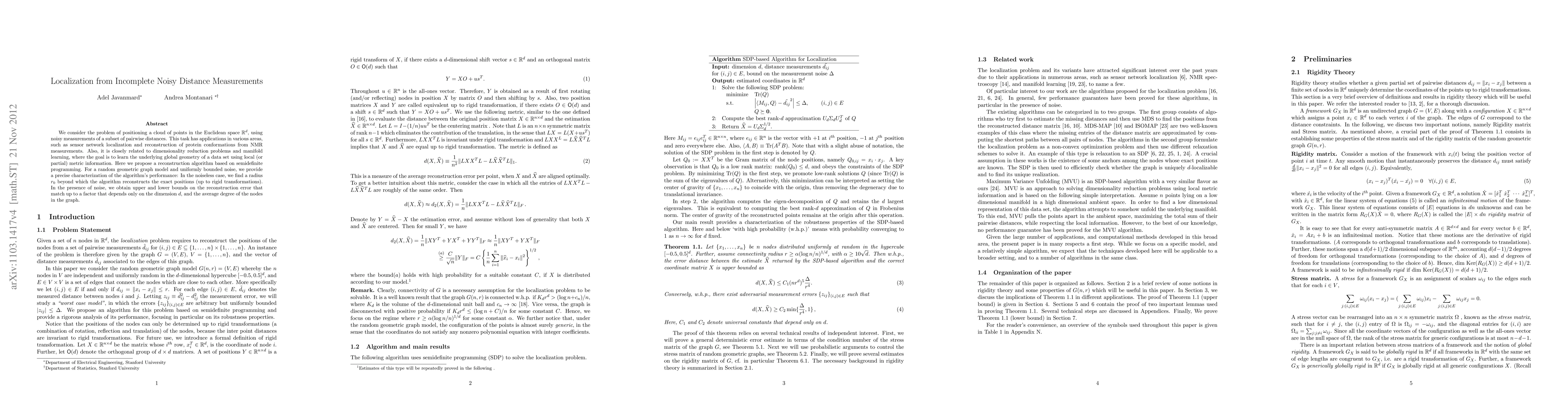 This paper proposes a semidefinite programming algorithm for positioning points in Euclidean space from incomplete, noisy distance measurements, applicable to sensor networks and protein conformation reconstruction. The authors provide performance bounds for the algorithm, showing exact reconstruction beyond a certain radius in noiseless conditions and matching upper and lower bounds on reconstruction error under noise.