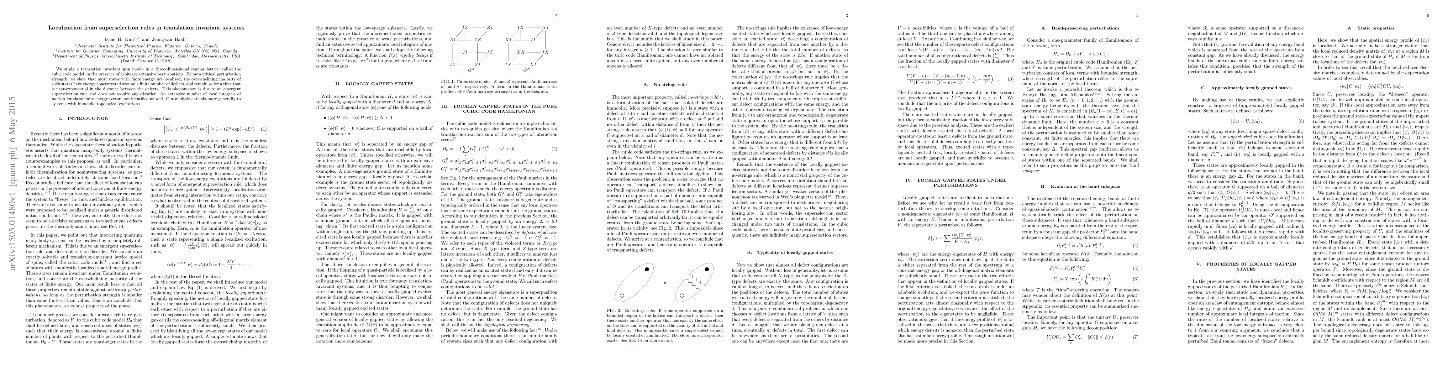 This paper investigates a translation invariant spin model in a cubic lattice under extensive perturbations, demonstrating that localized states emerge below a critical perturbation strength due to an emergent superselection rule, without requiring any disorder. The study identifies extensive local integrals of motion and extends these findings to systems with immobile topological excitations.