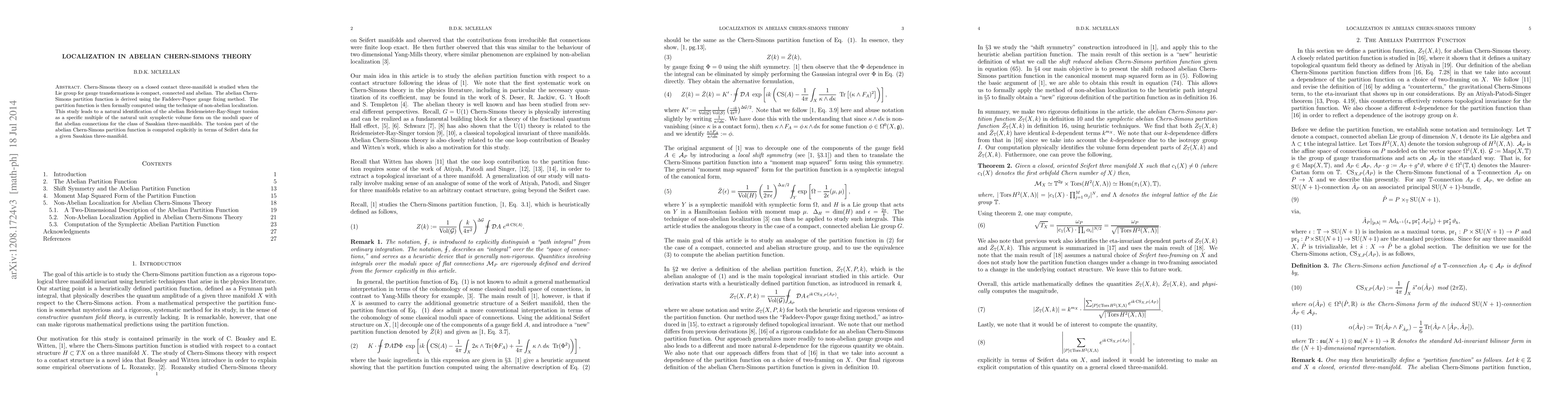 This paper rigorously defines and derives the abelian Chern-Simons partition function using the Faddeev-Popov method and symplectic localization techniques, establishing it as a topological invariant of closed contact three-manifolds. It also explicitly computes the torsion part of this partition function in terms of Seifert data for Sasakian three-manifolds.