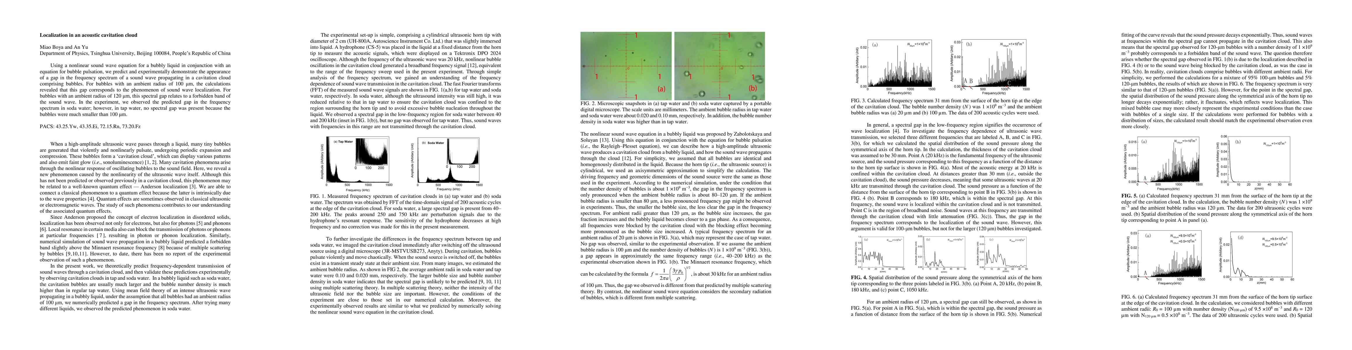 The paper presents a study on acoustic cavitation clouds, using mathematical models to predict and experimentally verify a gap in sound wave frequency spectra. This gap, termed 'sound wave localization' for 100 μm bubbles and a 'forbidden band' for 120 μm bubbles, was observed in soda water but not in tap water due to bubble size differences.