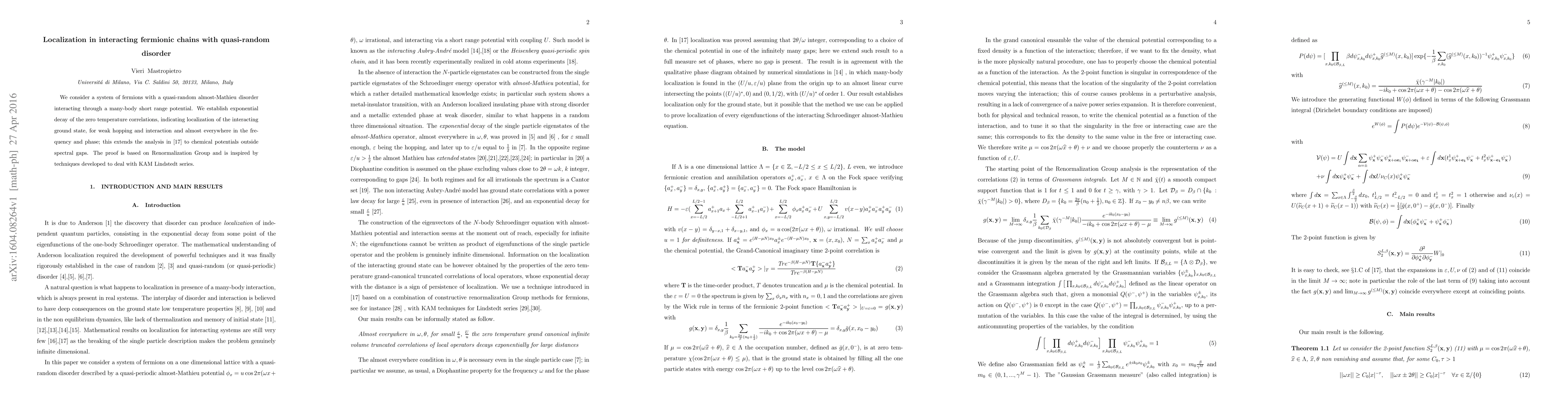 This paper explores fermions in a quasi-random disordered chain interacting via a short-range potential, demonstrating localization of the ground state through exponential decay of correlations. The findings extend previous results to chemical potentials outside spectral gaps, utilizing Renormalization Group techniques inspired by KAM theory.
