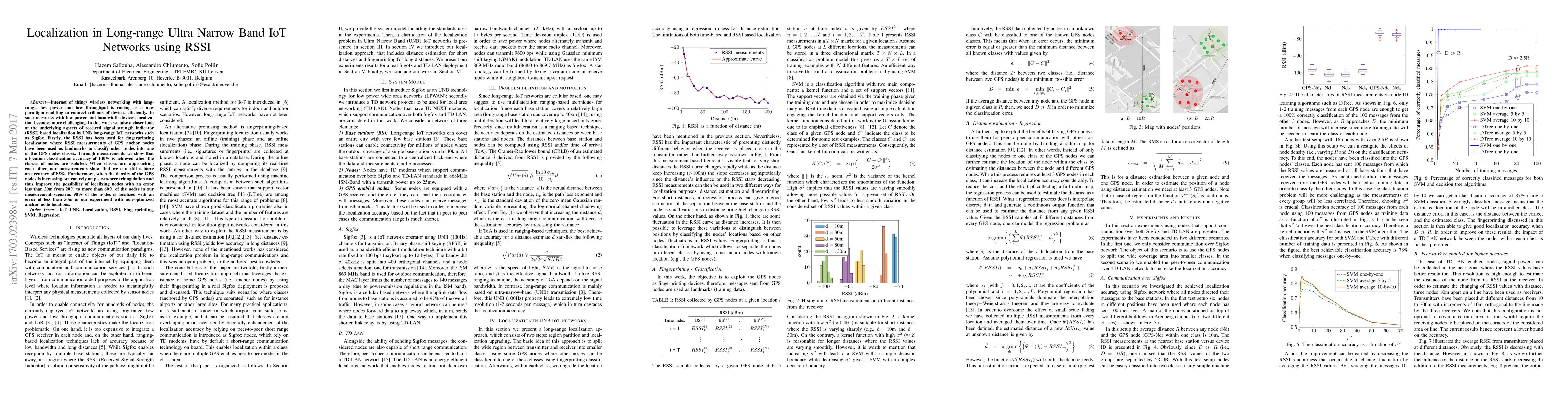 This paper investigates RSSI-based localization in long-range, low-power Ultra Narrow Band IoT networks, achieving 100% accuracy in isolated node classes and 85% when classes overlap. It also demonstrates improved localization accuracy through peer-to-peer triangulation, localizing over 60% of nodes with an error of less than 20m.