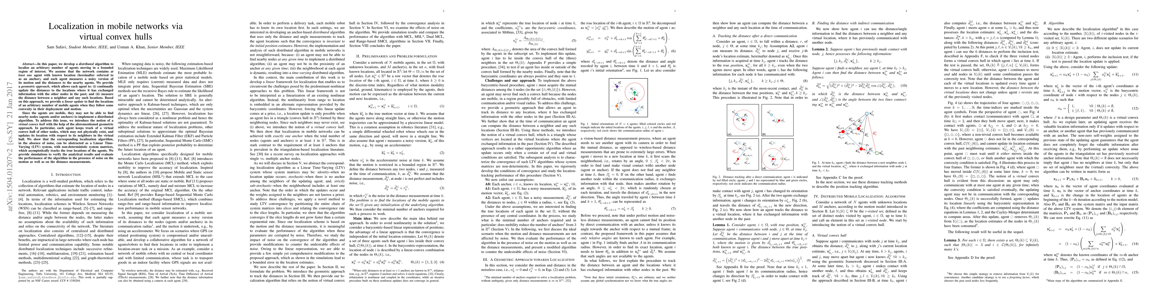 In this paper, we develop a \textit{distributed} algorithm to localize an arbitrary number of agents moving in a bounded region of interest. We assume that the network contains \textit{at least one} agent with known location (hereinafter referred to as an anchor), and each agent measures a noisy version of its motion and the distances to the nearby agents. We provide a~\emph{geometric approach}, which allows each agent to: (i) continually update the distances to the locations where it has exchanged information with the other nodes in the past; and (ii) measure the distance between a neighbor and any such locations. Based on this approach, we provide a \emph{linear update} to find the locations of an arbitrary number of mobile agents when they follow some convexity in their deployment and motion. Since the agents are mobile, they may not be able to find nearby nodes (agents and/or anchors) to implement a distributed algorithm. To address this issue, we introduce the notion of a \emph{virtual convex hull} with the help of the aforementioned geometric approach. In particular, each agent keeps track of a virtual convex hull of other nodes, which may not physically exist, and updates its location with respect to its neighbors in the virtual hull. We show that the corresponding localization algorithm, in the absence of noise, can be abstracted as a Linear Time-Varying (LTV) system, with non-deterministic system matrices, which asymptotically tracks the true locations of the agents. We provide simulations to verify the analytical results and evaluate the performance of the algorithm in the presence of noise on the motion as well as on the distance measurements.