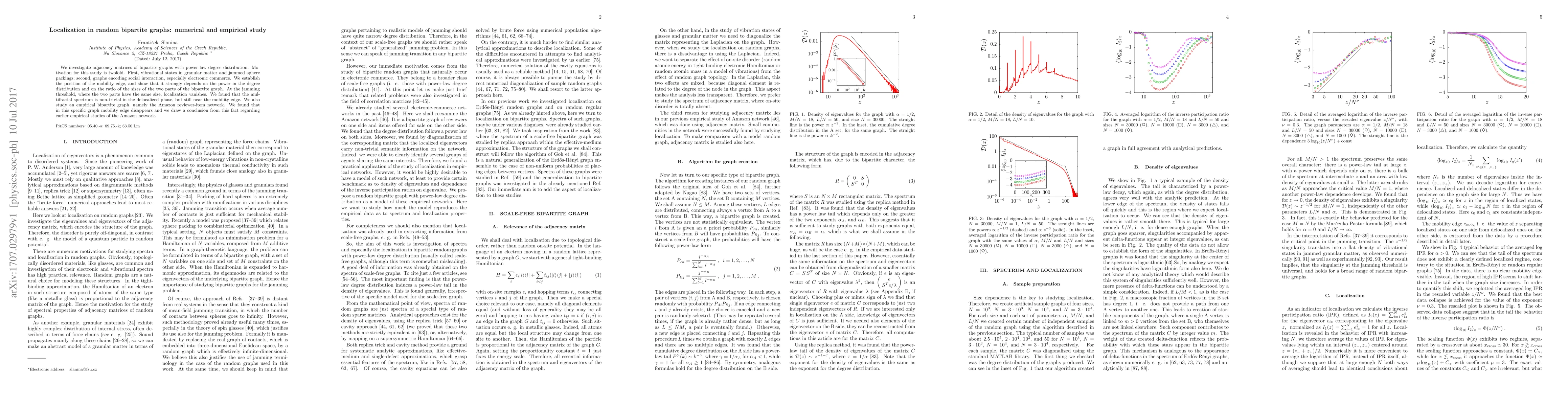 We investigate adjacency matrices of bipartite graphs with power-law degree distribution. Motivation for this study is twofold. First, vibrational states in granular matter and jammed sphere packings; second, graphs encoding social interaction, especially electronic commerce. We establish the position of the mobility edge, and show that it strongly depends on the power in the degree distribution and on the ratio of the sizes of the two parts of the bipartite graph. At the jamming threshold, where the two parts have the same size, localization vanishes. We found that the multifractal spectrum is non-trivial in the delocalized phase, but still near the mobility edge. We also study an empirical bipartite graph, namely the Amazon reviewer-item network. We found that in this specific graph mobility edge disappears and we draw a conclusion from this fact regarding earlier empirical studies of the Amazon network.