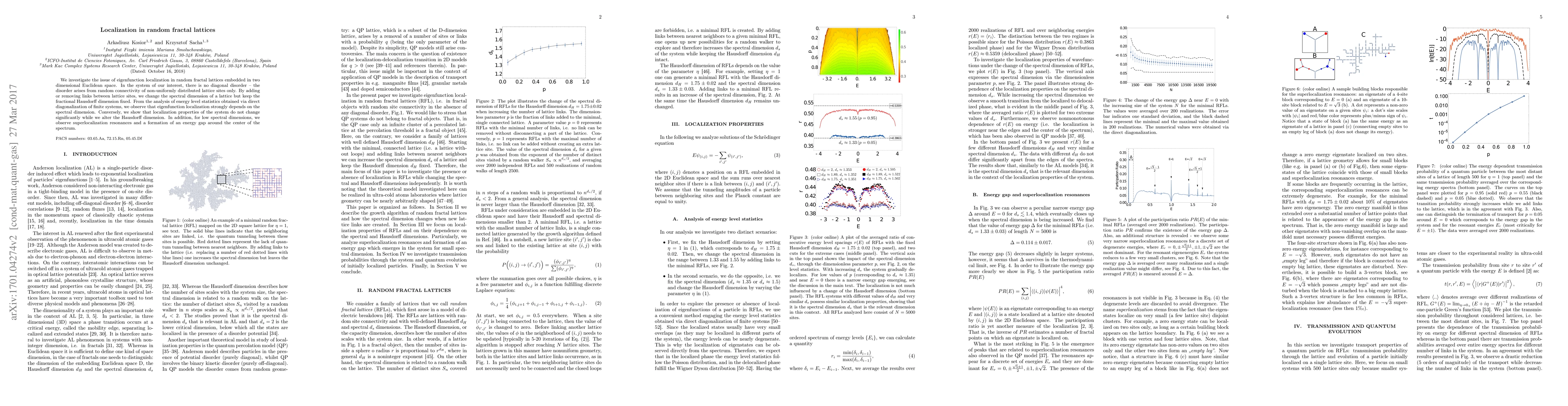 We investigate the issue of eigenfunction localization in random fractal lattices embedded in two dimensional Euclidean space. In the system of our interest, there is no diagonal disorder -- the disorder arises from random connectivity of non-uniformly distributed lattice sites only. By adding or removing links between lattice sites, we change the spectral dimension of a lattice but keep the fractional Hausdorff dimension fixed. From the analysis of energy level statistics obtained via direct diagonalization of finite systems, we observe that eigenfunction localization strongly depends on the spectral dimension. Conversely, we show that localization properties of the system do not change significantly while we alter the Hausdorff dimension. In addition, for low spectral dimensions, we observe superlocalization resonances and a formation of an energy gap around the center of the spectrum.