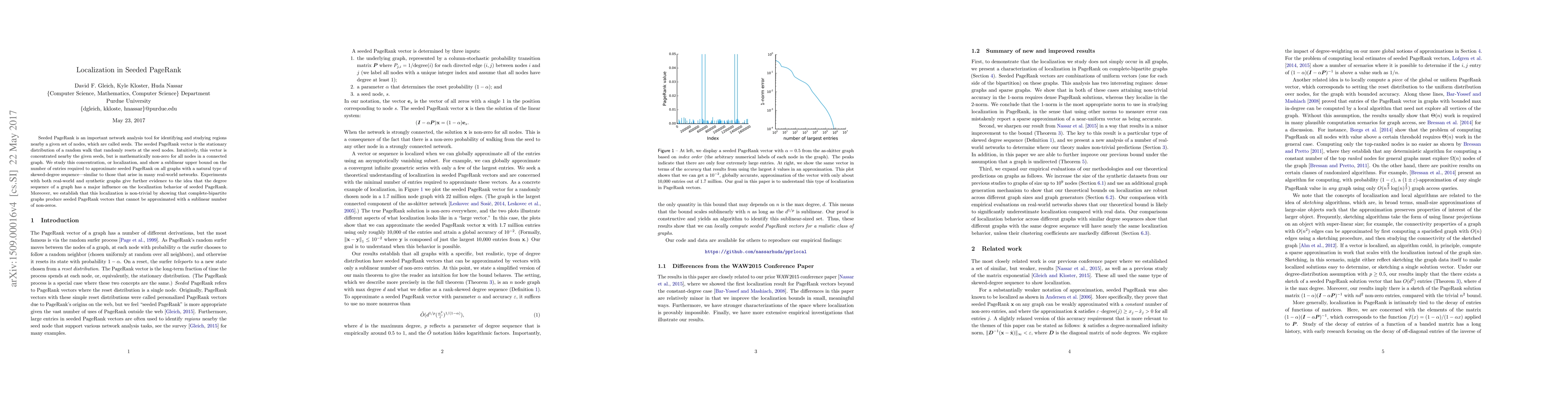 This paper investigates the localization properties of seeded PageRank, demonstrating that it concentrates near seed nodes but remains non-zero across all nodes in a connected graph. The study establishes a sublinear upper bound for approximating seeded PageRank on graphs with skewed-degree sequences, highlighting the significant impact of graph degree distribution on localization behavior.