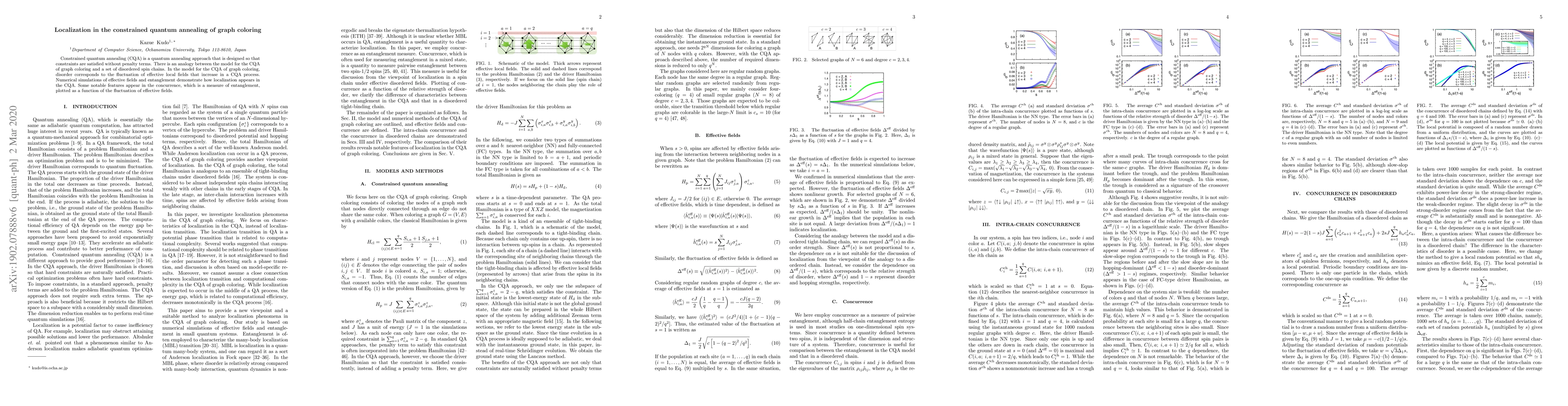 Constrained quantum annealing (CQA) is a quantum annealing approach that is designed so that constraints are satisfied without penalty terms. There is an analogy between the model for the CQA of graph coloring and a set of disordered spin chains. In the model for the CQA of graph coloring, disorder corresponds to the fluctuation of effective local fields that increase in a CQA process. Numerical simulations of effective fields and entanglement demonstrate how localization appears in the CQA. Some notable features appear in the concurrence, which is a measure of entanglement, plotted as a function of the fluctuation of effective fields.