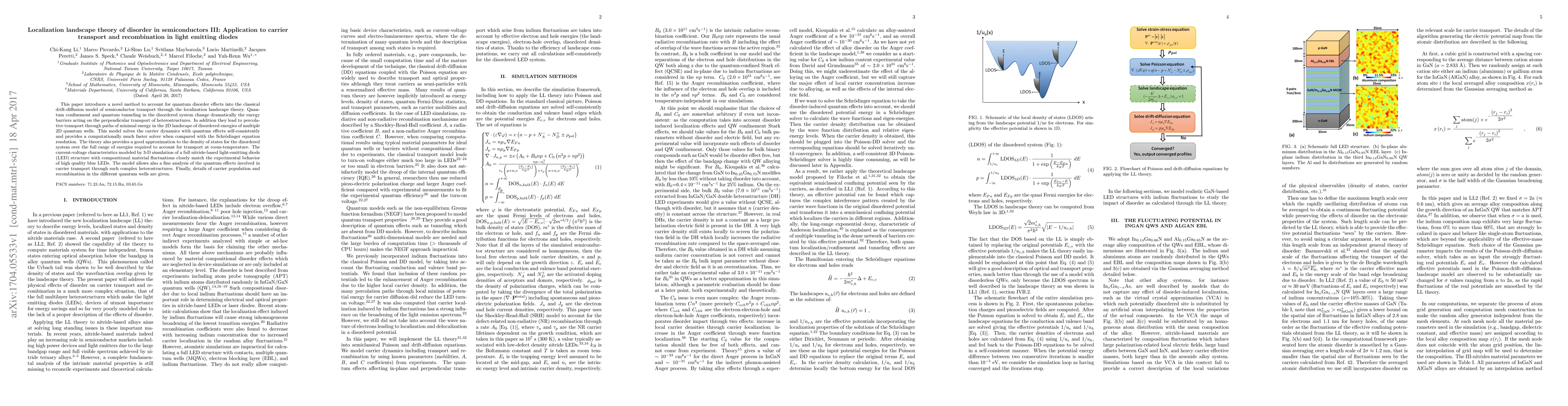 This paper applies localization landscape theory to model quantum disorder effects in semiconductor transport, providing a faster solution than the Schrödinger equation. The model accurately predicts the current-voltage characteristics of nitride-based LEDs and offers insights into carrier transport and recombination in quantum wells.