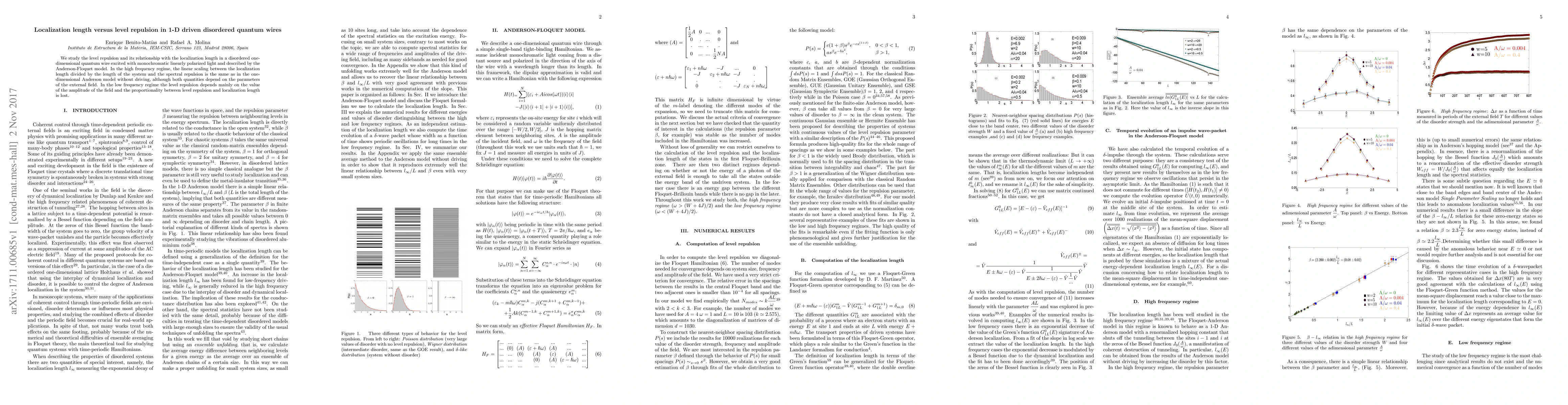 This paper investigates the relationship between level repulsion and localization length in a 1-D disordered quantum wire driven by monochromatic light, modeled by the Anderson-Floquet model. At high frequencies, both level repulsion and localization length scale similarly to the Anderson model without driving, while at low frequencies, level repulsion is mainly influenced by the amplitude of the field, breaking the proportionality with localization length.