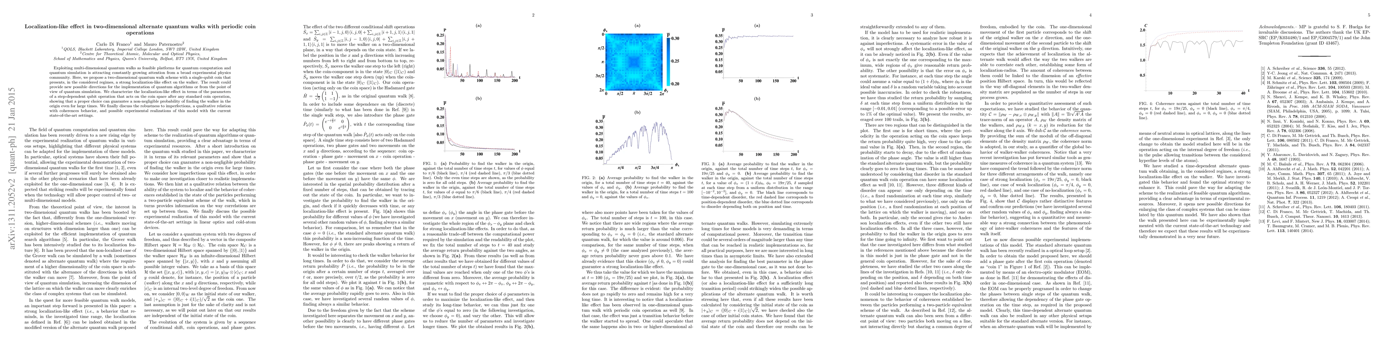 The paper proposes a two-dimensional quantum walk scheme with periodic coin operations that demonstrates a localization-like effect, potentially enhancing quantum computation and simulation. The study details how a step-dependent qubit operation can ensure high probabilities of finding the walker at the origin, discussing robustness and experimental feasibility.