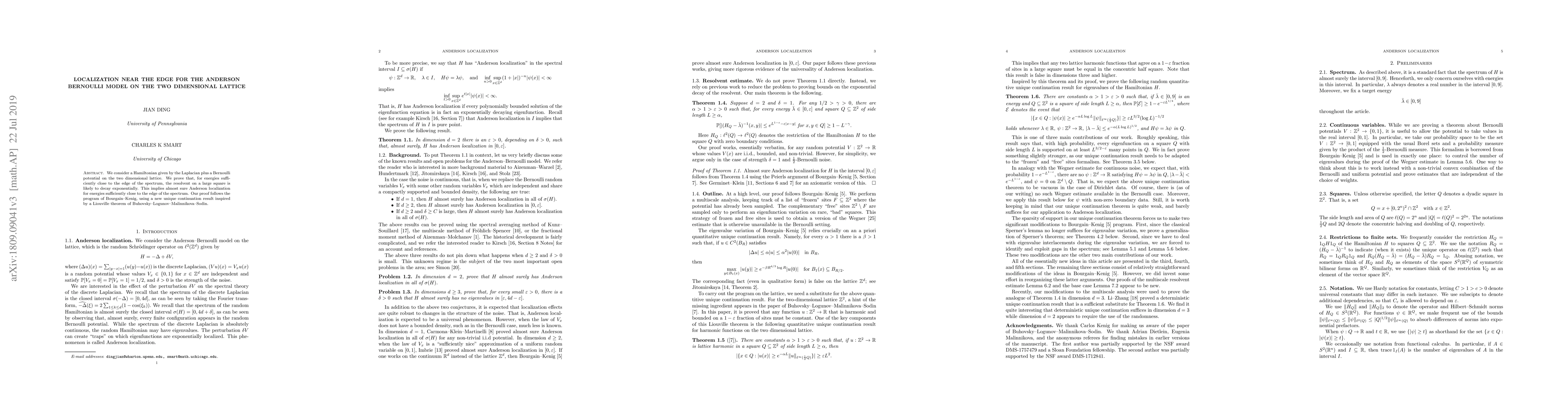 We consider a Hamiltonian given by the Laplacian plus a Bernoulli potential on the two dimensional lattice. We prove that, for energies sufficiently close to the edge of the spectrum, the resolvent on a large square is likely to decay exponentially. This implies almost sure Anderson localization for energies sufficiently close to the edge of the spectrum. Our proof follows the program of Bourgain--Kenig, using a new unique continuation result inspired by a Liouville theorem of Buhovsky--Logunov--Malinnikova--Sodin.