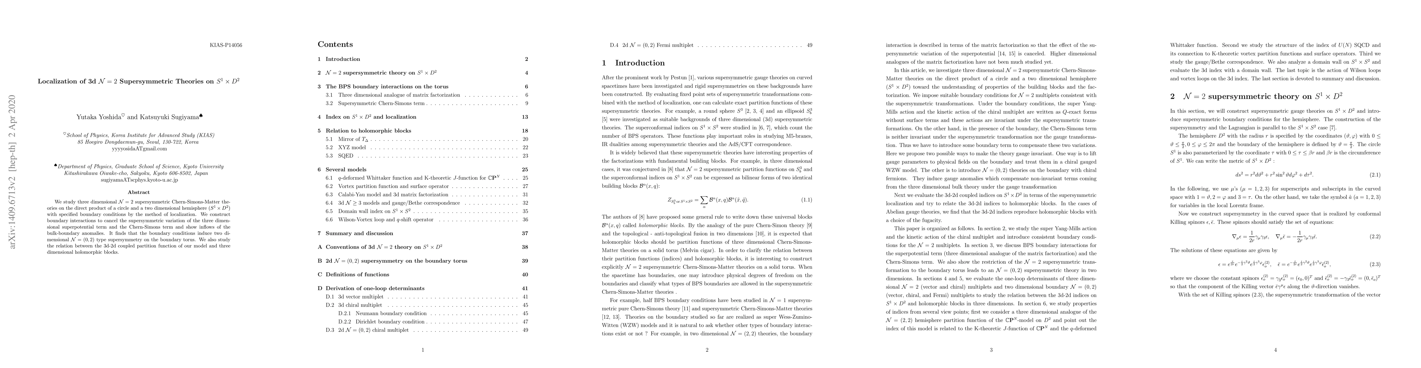 We study three dimensional $\mathcal{N}=2$ supersymmetric Chern-Simons-Matter theories on the direct product of a circle and a two dimensional hemisphere ($S^1 \times D^2$) with specified boundary conditions by the method of localization. We construct boundary interactions to cancel the supersymmetric variation of the three dimensional superpotential term and the Chern-Simons term and show inflows of the bulk-boundary anomalies. It finds that the boundary conditions induce two dimensional $\mathcal{N}=(0,2)$ type supersymmetry on the boundary torus. We also study the relation between the 3d-2d coupled partition function of our model and three dimensional holomorphic blocks.