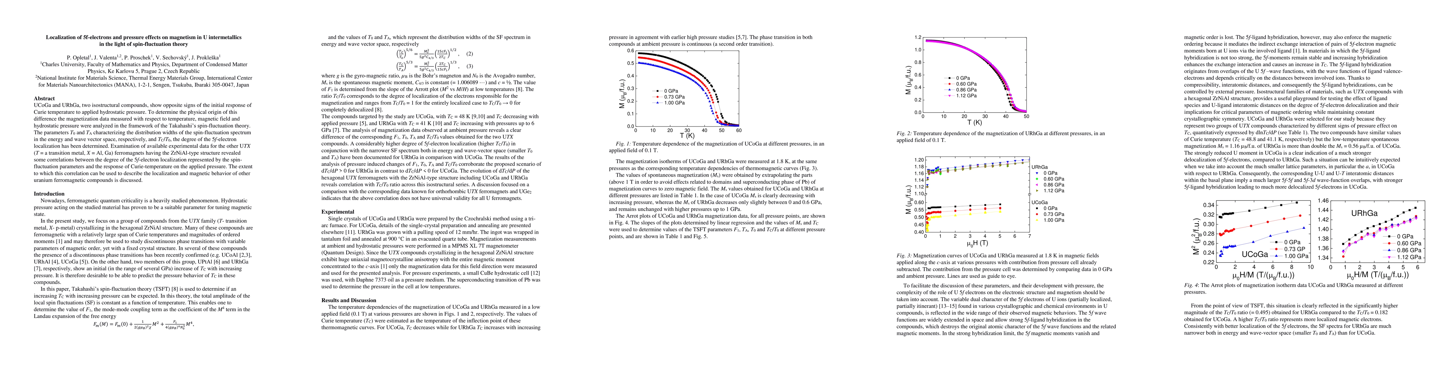 UCoGa and URhGa, two isostructural compounds show opposite signs of the initial response of Curie temperature to applied hydrostatic premenssure. To determine the physical origin of this contradiction the magnetization data measured with respect to temperature, magnetic field and hydrostatic pressure were analyzed in the framework of the Takahashi's spin-fluctuation theory. The parameters T0 and TA characterizing the distribution widths of the spin-fluctuation spectrum in the energy and wave vector space, respectively, and TC/T0, the degree of the 5f-electron localization have been determined. Examination of available experimental data for the other UTX (T = a transition metal, X = Al, Ga) ferromagnets having the ZrNiAl-type structure revealed some correlations between the degree of the 5f-electron localization represented by the spin-fluctuation parameters and the response of Curie-temperature on the applied pressure. These observations may be applied more generally to describe the localization and magnetic behaviors of the majority of the uranium ferromagnetic compounds.