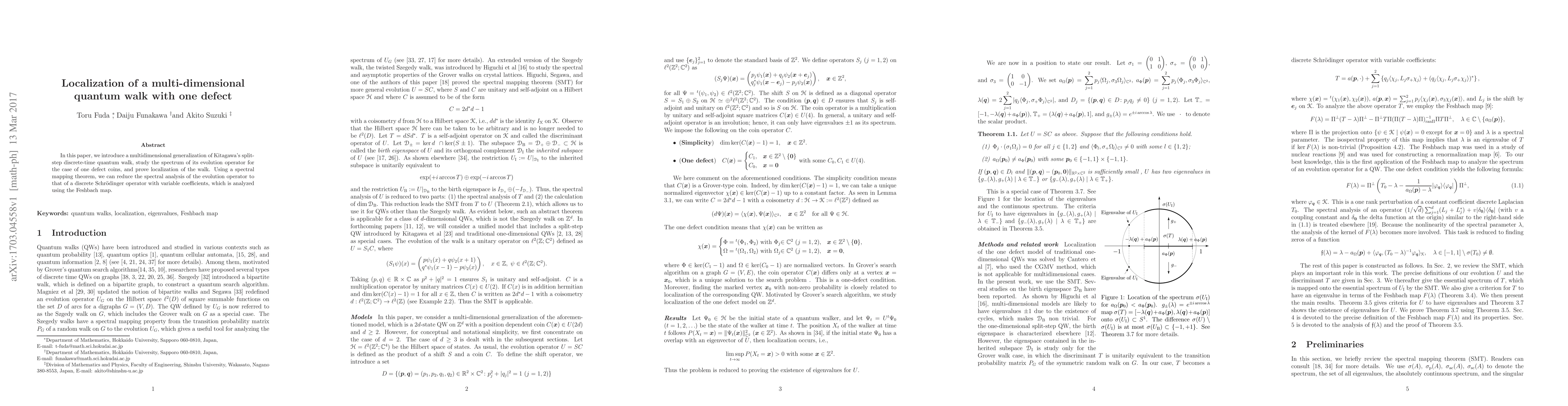 This paper generalizes Kitagawa's quantum walk to multiple dimensions with a single defect coin, proving localization through spectral analysis. The evolution operator's spectrum is reduced to a discrete Schrödinger operator with variable coefficients, analyzed using the Feshbach map.