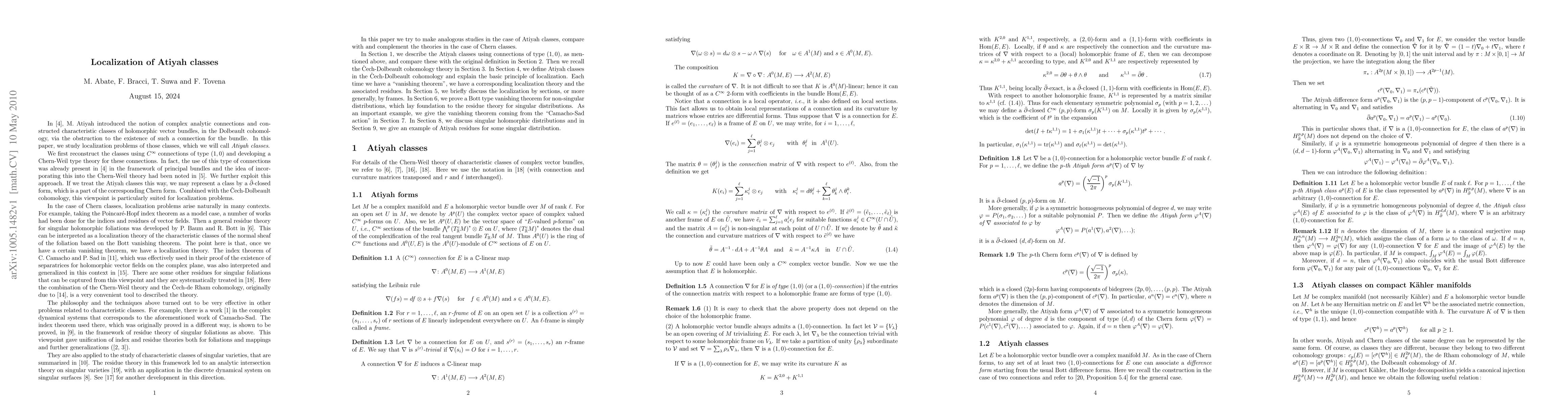 This paper constructs Atiyah classes via debar-closed forms and utilizes Cech-Dolbeault cohomology to explore their vanishing properties and localization, along with relevant applications.