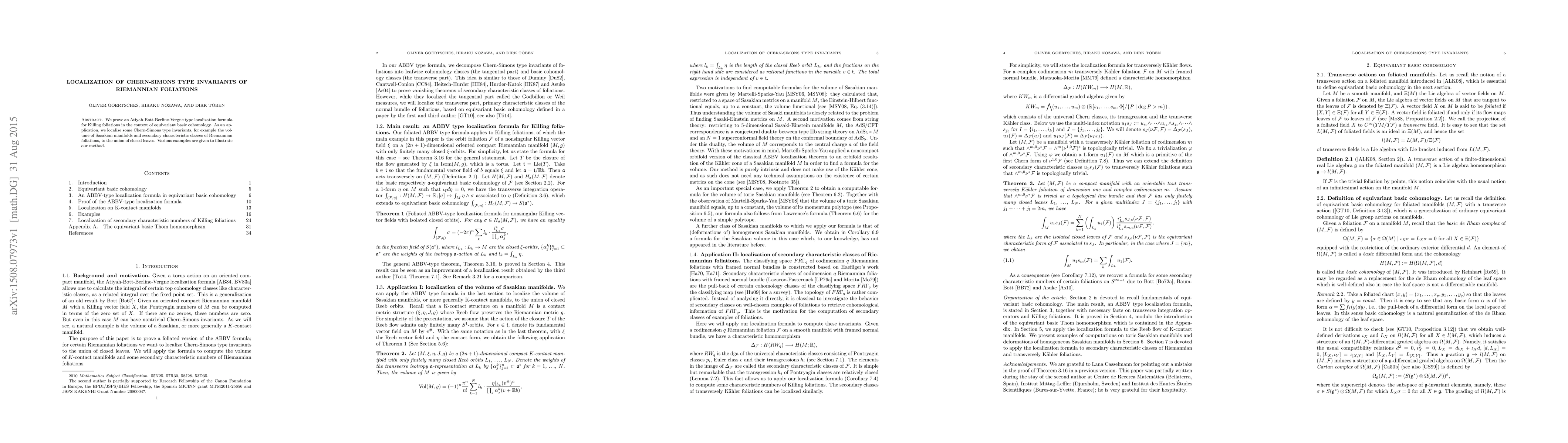 We prove an Atiyah-Bott-Berline-Vergne type localization formula for Killing foliations in the context of equivariant basic cohomology. As an application, we localize some Chern-Simons type invariants, for example the volume of Sasakian manifolds and secondary characteristic classes of Riemannian foliations, to the union of closed leaves. Various examples are given to illustrate our method.