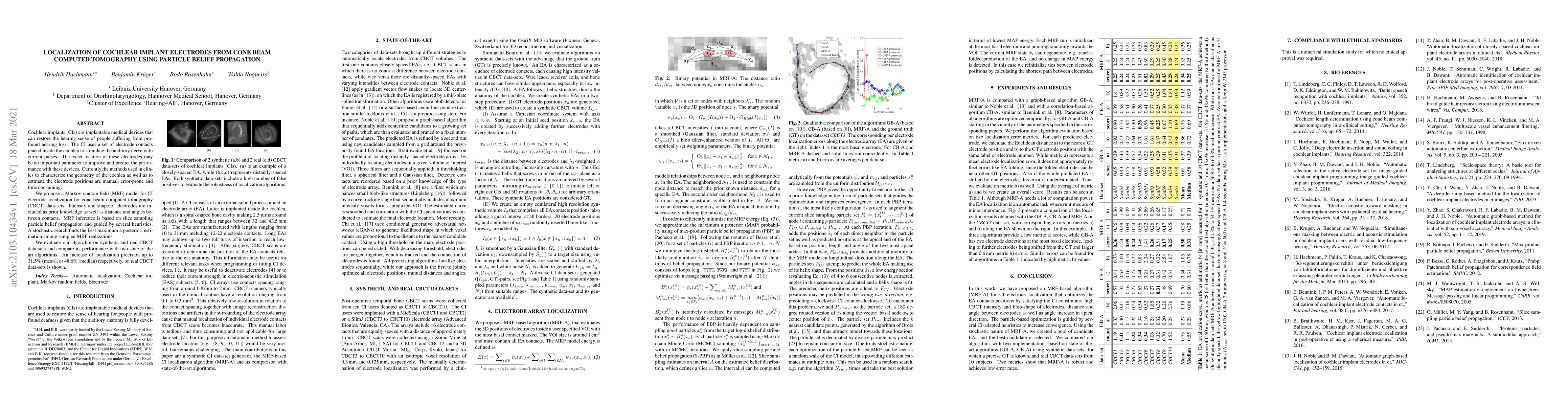 The paper introduces a novel MRF-based algorithm (MRF-A) for cochlear implant electrode localization, utilizing particle belief propagation and various heuristics to efficiently optimize electrode positions, distances, and angles.
