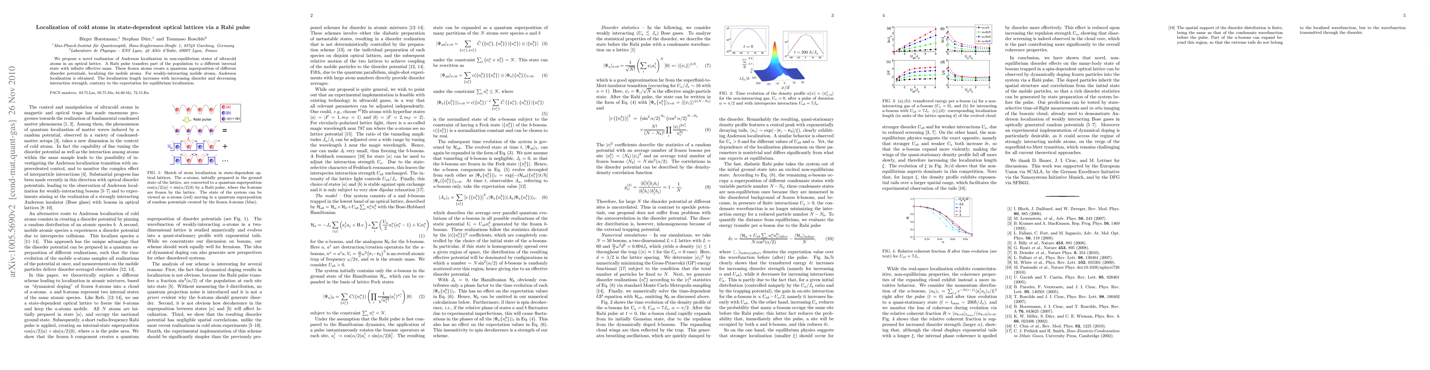 This research proposes a method to achieve Anderson localization in ultracold atoms using a Rabi pulse to create a state-dependent optical lattice, resulting in suppressed tunneling and localization. The study finds that non-interacting and weakly interacting bosons exhibit a quasi-stationary profile with exponentially decaying tails, and localization length increases with disorder and interaction strength.