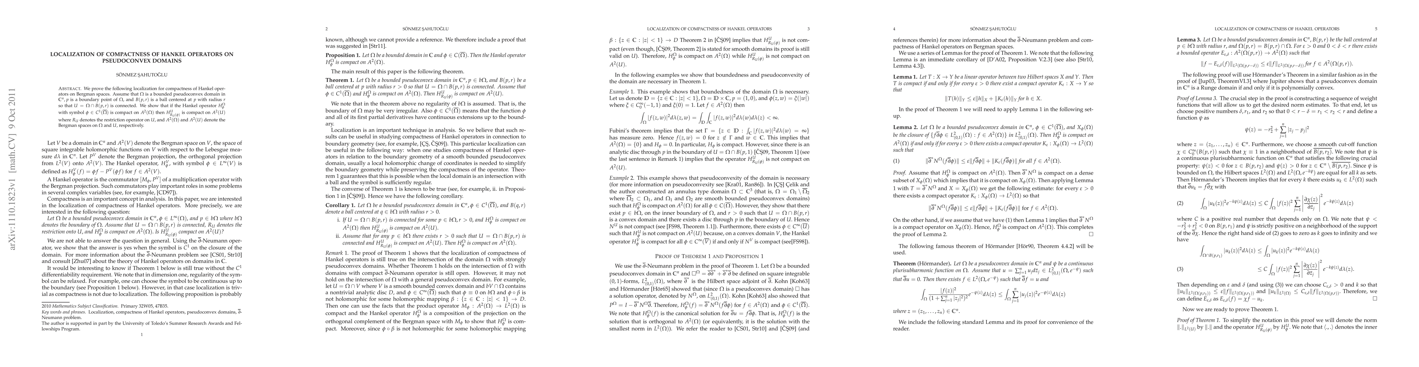 This paper proves that if a Hankel operator H^D_f is compact on Bergman spaces of a bounded pseudoconvex domain D in C^n, then it remains compact on the Bergman space of a connected neighborhood U within D. This localization result applies to boundary points p of D and sufficiently small balls B(p,r) intersecting D.