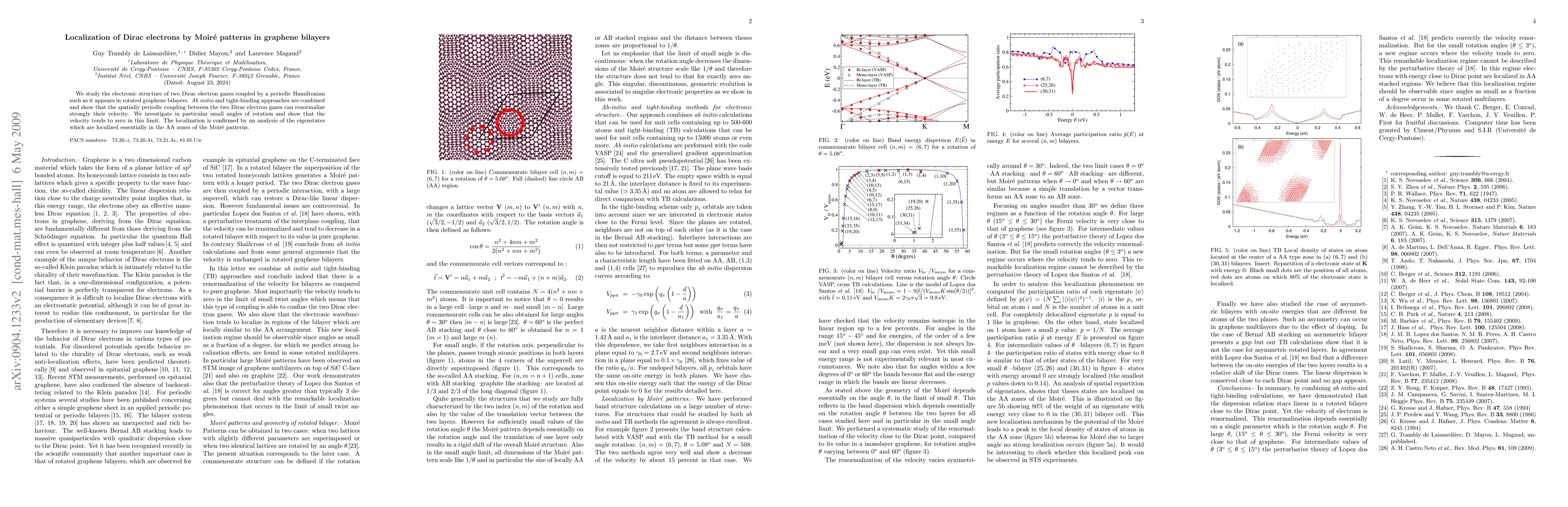 We study the electronic structure of two Dirac electron gazes coupled by a periodic Hamiltonian such as it appears in rotated graphene bilayers. Ab initio and tight-binding approaches are combined and show that the spatially periodic coupling between the two Dirac electron gazes can renormalize strongly their velocity. We investigate in particular small angles of rotation and show that the velocity tends to zero in this limit. The localization is confirmed by an analysis of the eigenstates which are localized essentially in the AA zones of the Moire patterns.