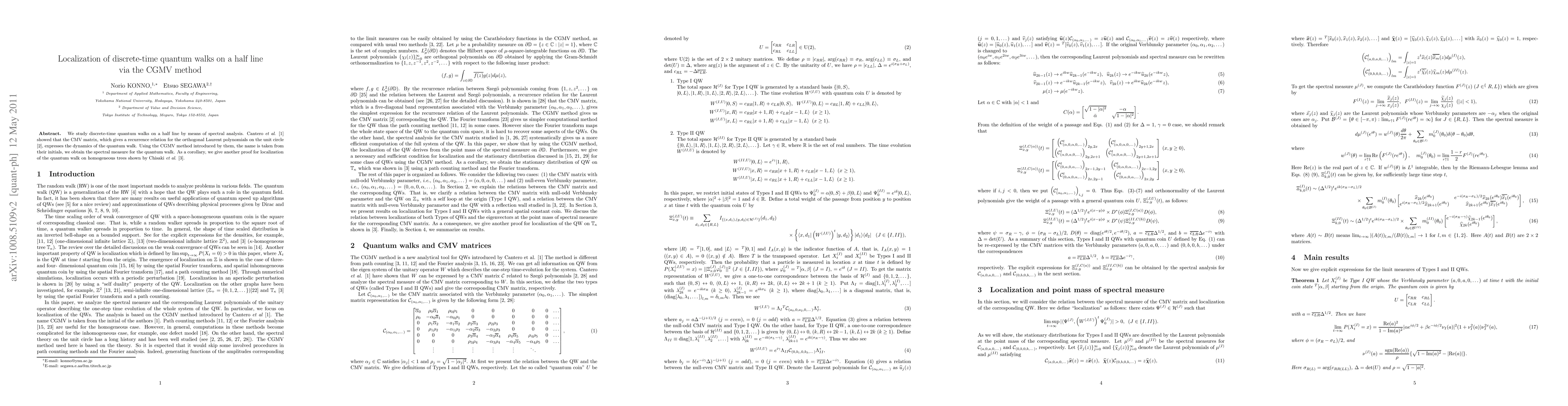 This paper investigates the dynamics of discrete-time quantum walks on a half line using spectral analysis and the CGMV method. It derives the spectral measure for the quantum walk and provides a new proof for the localization of quantum walks on homogeneous trees.