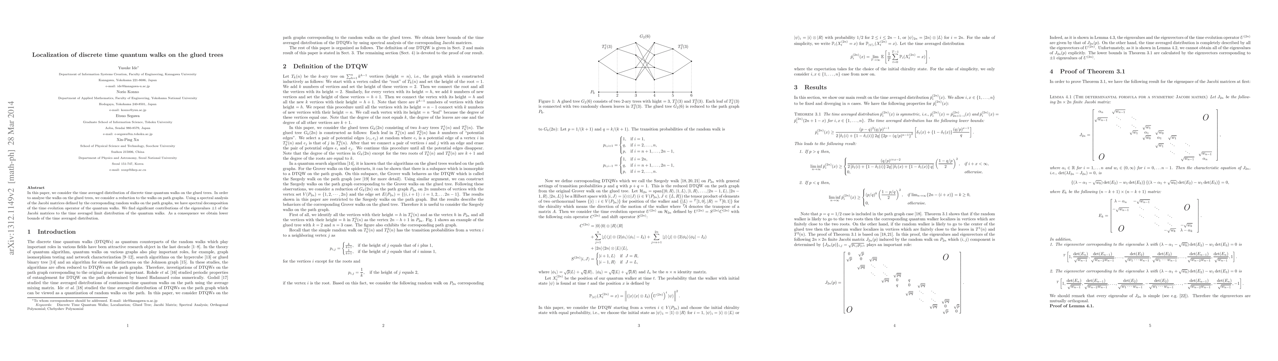 This paper investigates the time averaged distribution of discrete time quantum walks on glued trees by reducing them to path graphs. Through spectral analysis of Jacobi matrices, it finds significant contributions from eigenvalues ±1, leading to lower bounds for the time averaged distribution.