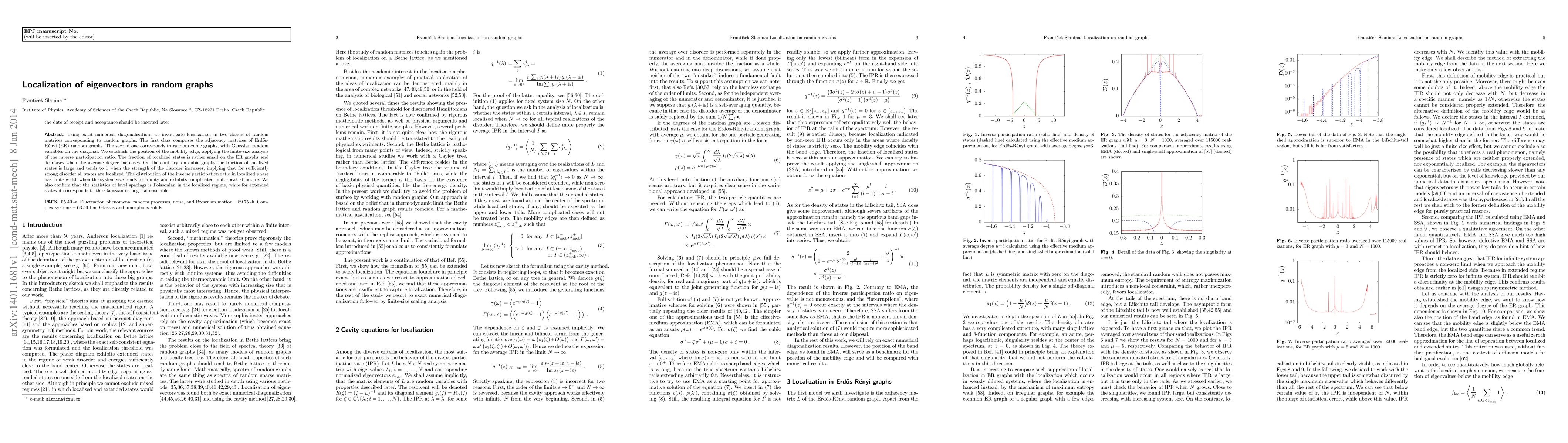 This paper investigates localization of eigenvectors in two classes of random matrices representing random graphs: Erdos-Renyi (ER) graphs and random cubic graphs. It finds that ER graphs have a small fraction of localized states that decrease with higher average degree, while cubic graphs show a large fraction of localized states that approach 1 with stronger disorder.