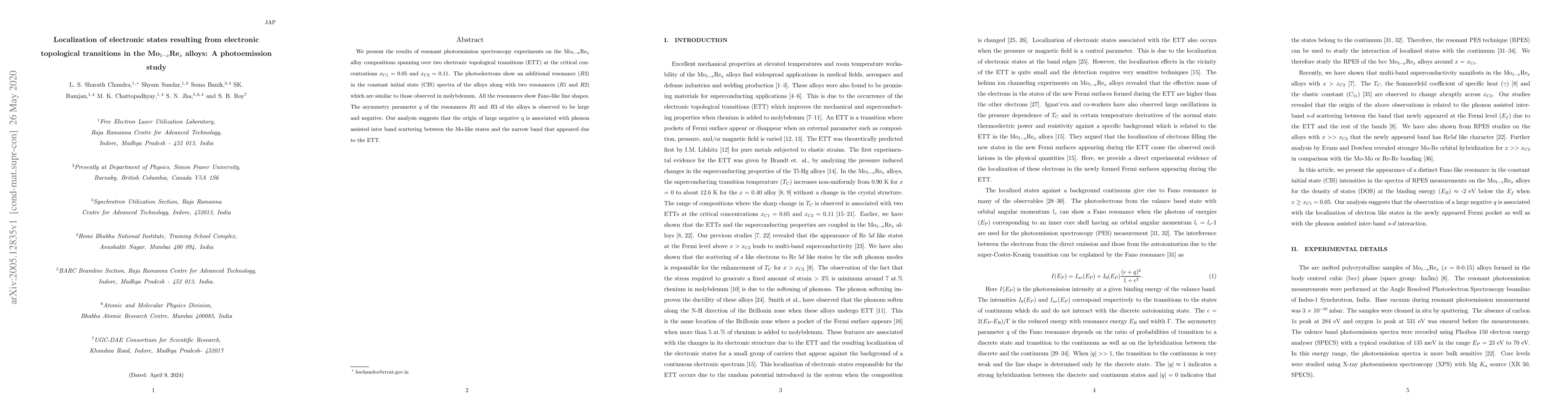 We present the results of resonant photoemission spectroscopy experiments on the Mo$_{1-x}$Re$_{x}$ alloy compositions spanning over two electronic topological transitions (ETT) at the critical concentrations $x_{C1}$ = 0.05 and $x_{C2}$ = 0.11. The photoelectrons show an additional resonance ($R3$) in the constant initial state (CIS) spectra of the alloys along with two resonances ($R1$ and $R2$) which are similar to those observed in molybdenum. All the resonances show Fano-like line shapes. The asymmetry parameter $q$ of the resonances $R1$ and $R3$ of the alloys is observed to be large and negative. Our analysis suggests that the origin of large negative q is associated with phonon assisted inter band scattering between the Mo-like states and the narrow band that appeared due to the ETT.