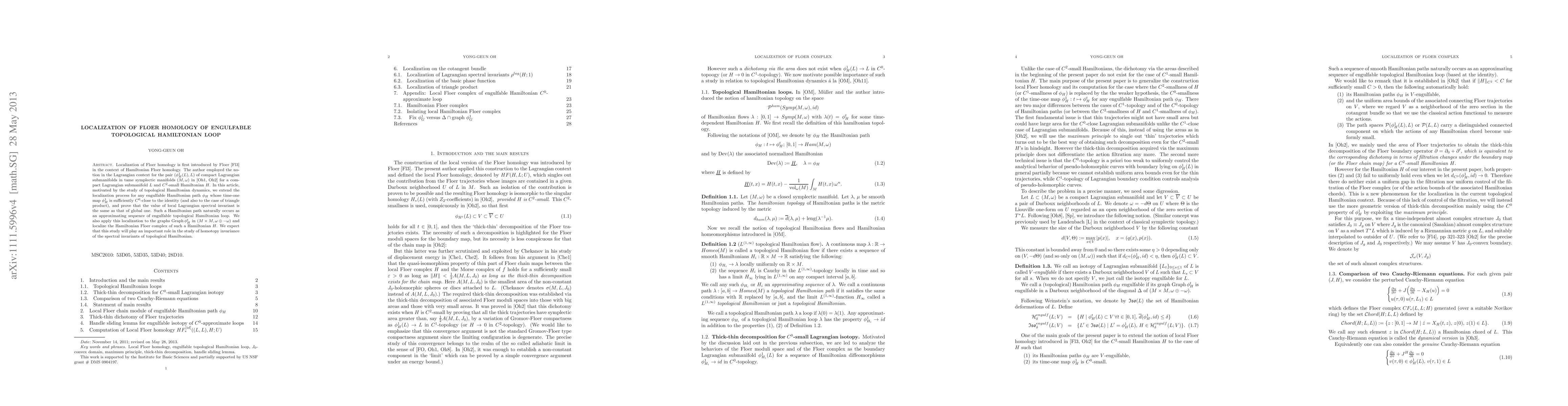 Localization of Floer homology is first introduced by Floer \cite{floer:fixed} in the context of Hamiltonian Floer homology. The author employed the notion in the Lagrangian context for the pair $(\phi_H^1(L),L)$ of compact Lagrangian submanifolds in tame symplectic manifolds $(M,\omega)$ in \cite{oh:newton,oh:imrn} for a compact Lagrangian submanifold $L$ and $C^2$-small Hamiltonian $H$. In this article, motivated by the study of topological Hamiltonian dynamics, we extend the localization process for any engulfable Hamiltonian path $\phi_H$ whose time-one map $\phi_H^1$ is sufficiently $C^0$-close to the identity (and also to the case of triangle product), and prove that the value of local Lagrangian spectral invariant is the same as that of global one. Such a Hamiltonian path naturally occurs as an approximating sequence of engulfable topological Hamiltonian loop. We also apply this localization to the graphs $\Graph \phi_H^t$ in $(M\times M, \omega\oplus -\omega)$ and localize the Hamiltonian Floer complex of such a Hamiltonian $H$. We expect that this study will play an important role in the study of homotopy invariance of the spectral invariants of topological Hamiltonian.