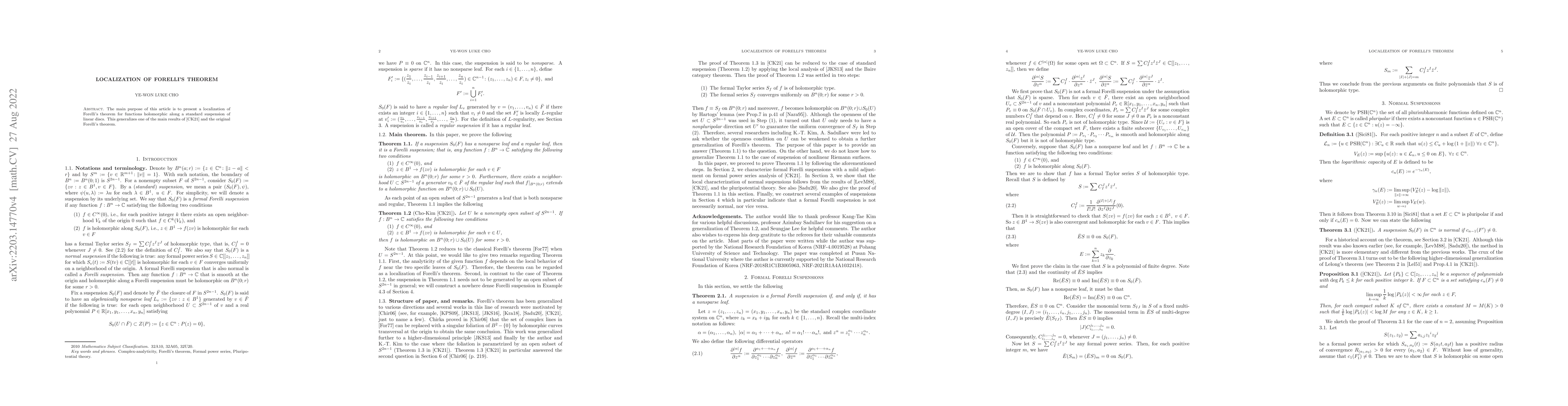 Summary: This paper localizes Forelli's theorem for holomorphic functions along linear discs, extending the results of \cite{CK21} and the original theorem. The localization provides a more nuanced understanding of the theorem's applicability in specific contexts.