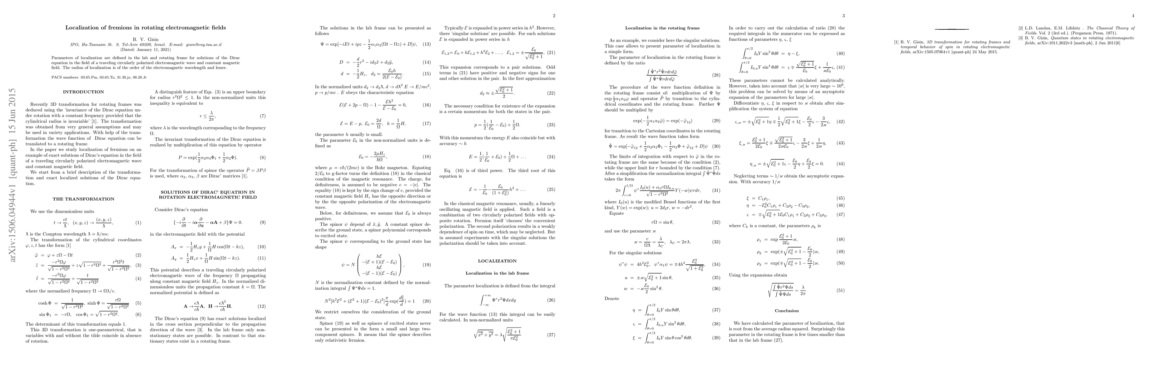 Summary: This research investigates the localization of fremions in both laboratory and rotating frames for solutions of the Dirac equation in a rotating electromagnetic field and a constant magnetic field, finding that the localization radius is comparable to the electromagnetic wavelength.