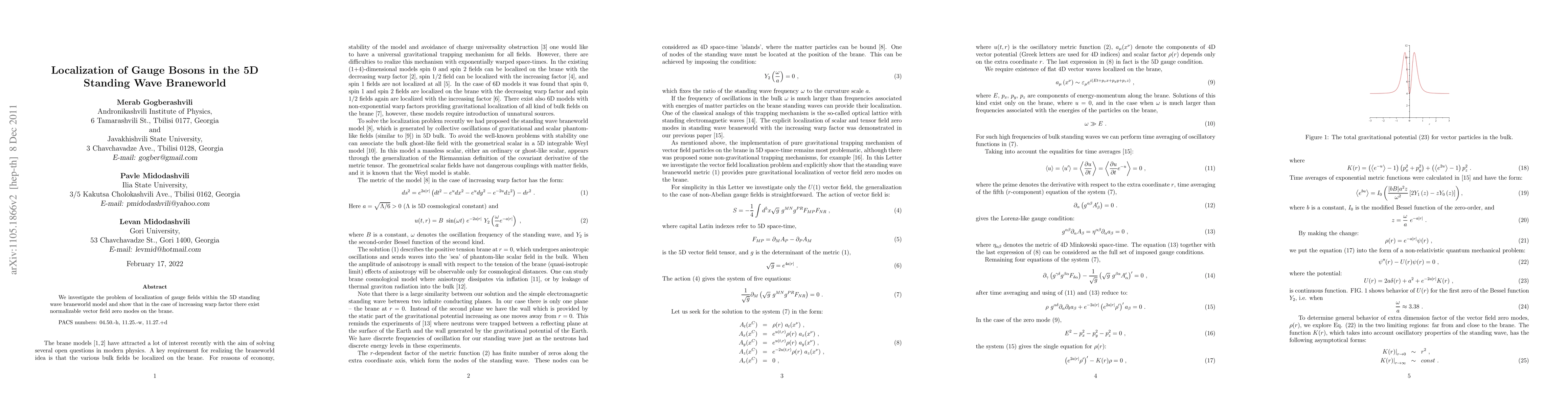 Summary: This paper explores the localization of gauge fields in the 5D standing wave braneworld model, demonstrating that higher warp factors enable the existence of normalizable vector field zero modes on the brane.