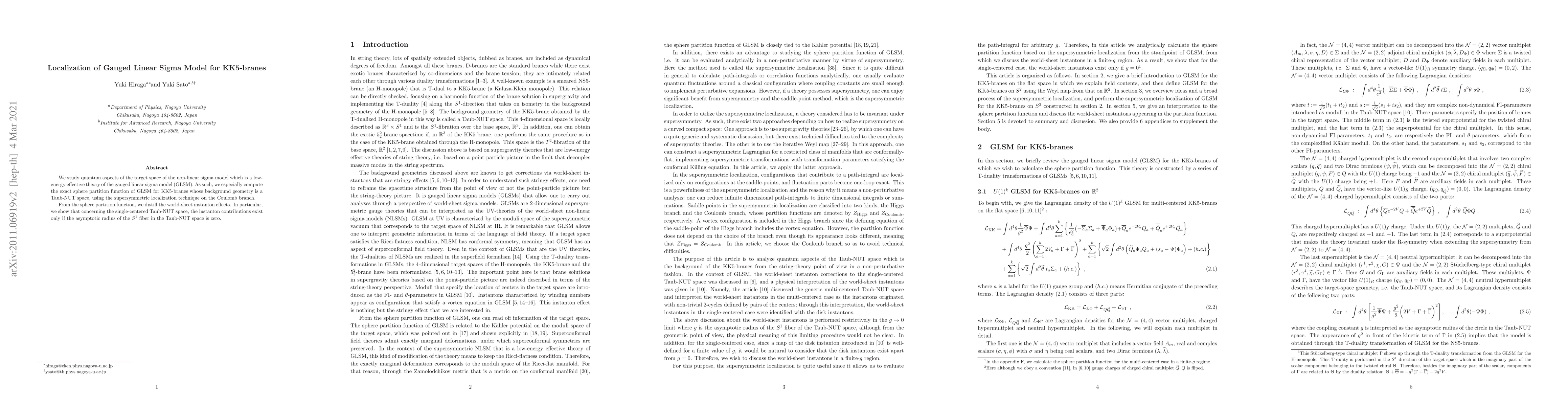 This paper investigates the quantum aspects of the gauged linear sigma model (GLSM) in the context of KK5-branes, employing supersymmetric localization to compute the exact sphere partition function on Taub-NUT space. The study reveals that world-sheet instanton effects are present only when the asymptotic radius of the $S^1$ fiber in Taub-NUT space is zero.
