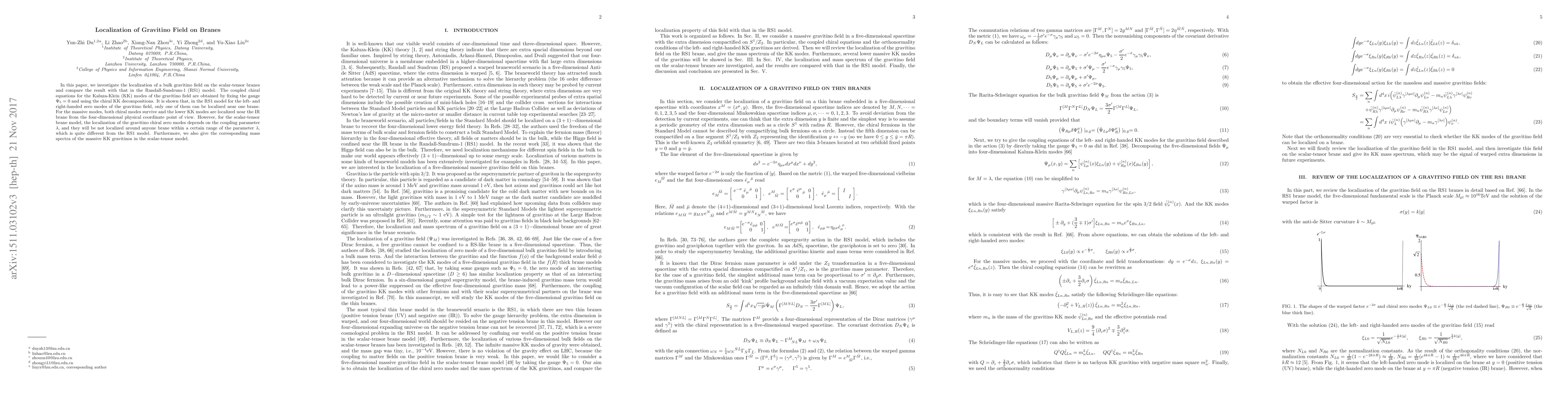 The research investigates the localization of a bulk gravitino field on scalar-tensor branes, comparing it with the Randall-Sundrum-1 (RS1) model. Coupled chiral equations for the Kaluza-Klein (KK) modes of the gravitino field are derived using gauge fixing and chiral decompositions.