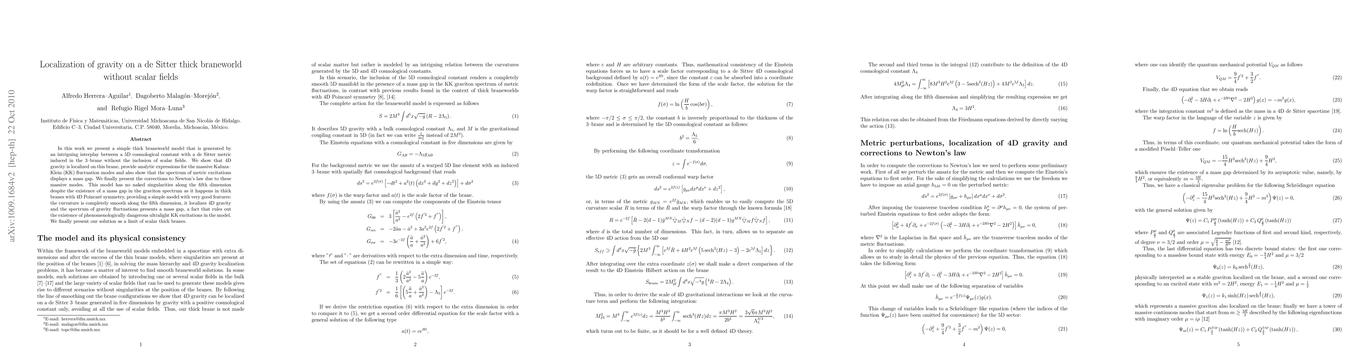 Researchers develop a new thick braneworld model where gravity is localized on a 3-brane without scalar fields, providing a smooth curvature along the fifth dimension and a mass gap in graviton spectrum.